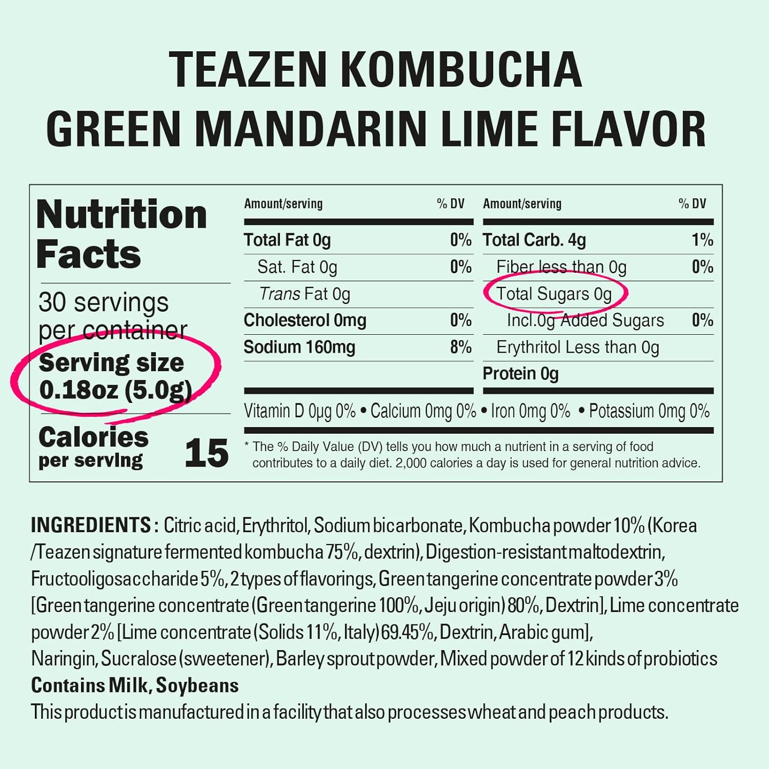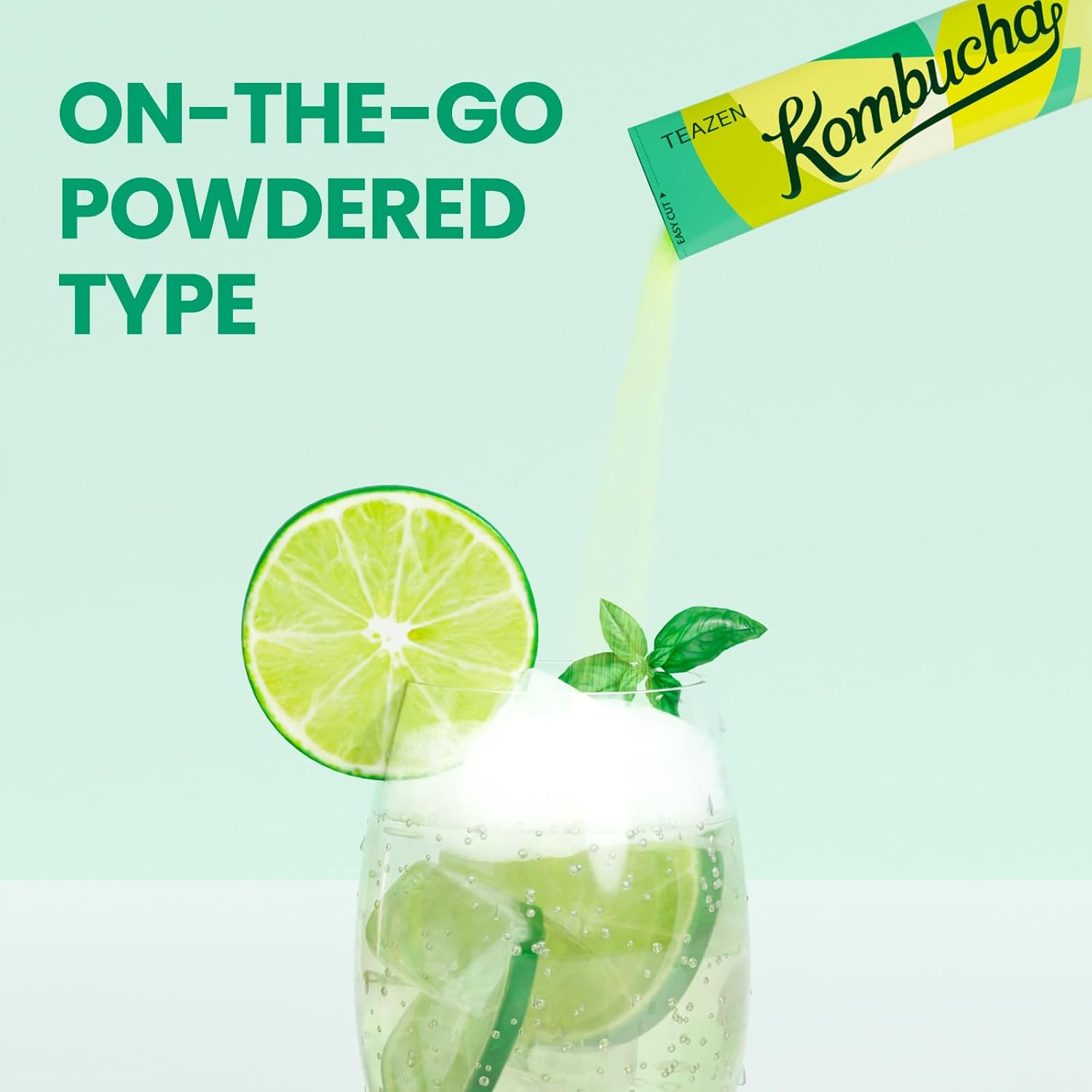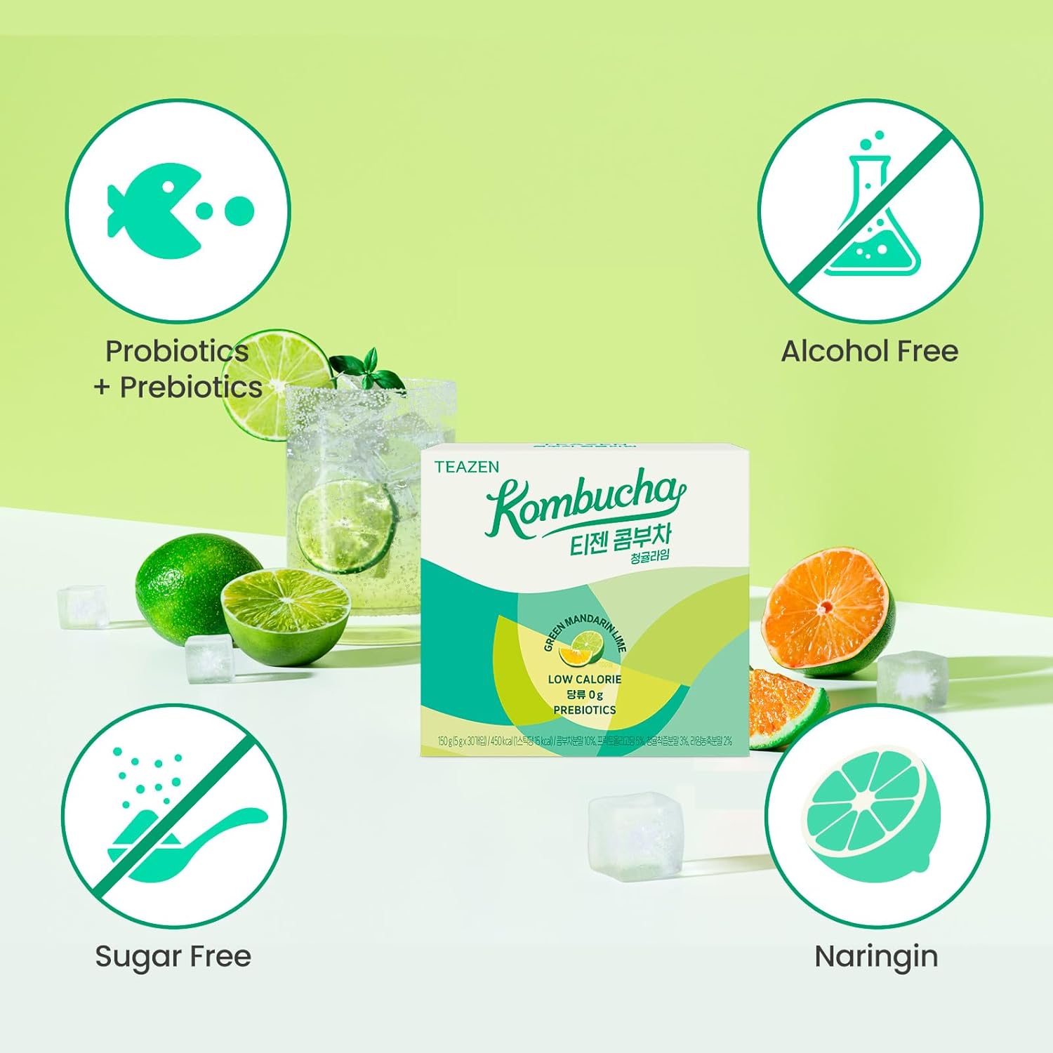 TEAZEN Green Mandarin Lime Kombucha Tea, Hydration Drink Mix, Sugar Free, Live Probiotics & Prebiotics, 30 Sticks, 5.29oz