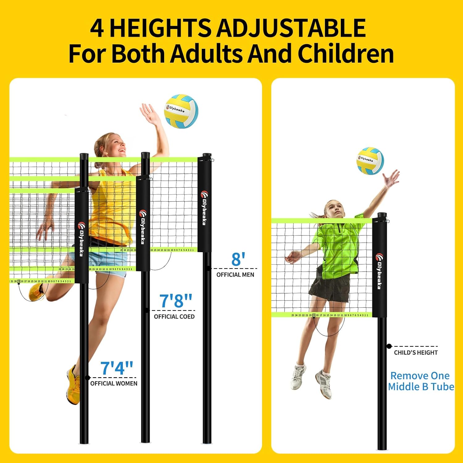 - ๐-๐๐ข๐ง ๐๐ง๐๐ฉ-๐๐ง ๐๐ง๐ฌ๐ญ๐๐ฅ๐ฅ + ๐ ๐๐๐ข๐ ๐ก๐ญ๐ฌ โ ๐๐ฅ๐ฅ ๐๐ ๐๐ฌ ๐๐๐ง ๐๐ฅ๐๐ฒ:No tools needed! Snap-on pole design clicks together in 5 minutes (plus picture manual for zero confusion), no waiting to start fun. With 4 adjustable heights (men 8โ for competitive play, co-ed 7โ8โโ/women 7โ4โโ for casual games, plus kid-friendly height), it fits adults, teens, and kidsโperfect for family gatherings or beach team matches. Save time on setup, spend more time playing!