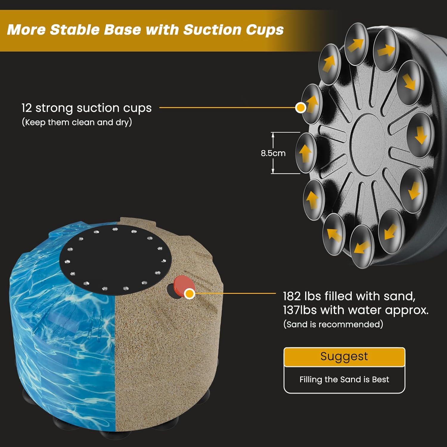 - Sturdy Floor Sucking Base: Rounded ABS base tank is engineered with a hole for filling sand or water (Weighs approx. 137 with water or approx. 205 lbs with sand) , includes 12 strong suction cups beneath to reduce base movement. We recommend filling with sand to ensure max stability