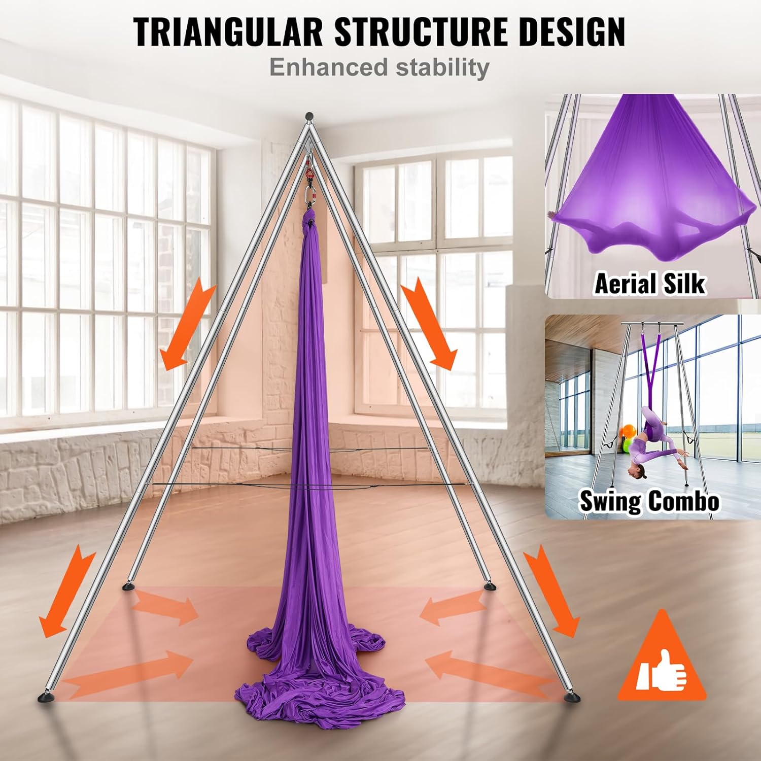 - Double Protection: Our aerial yoga stand frame's clever triangular structure, combined with a non-slip base, ensures stability in all poses. Practice with peace of mind, focusing on your yoga journey without security concerns.