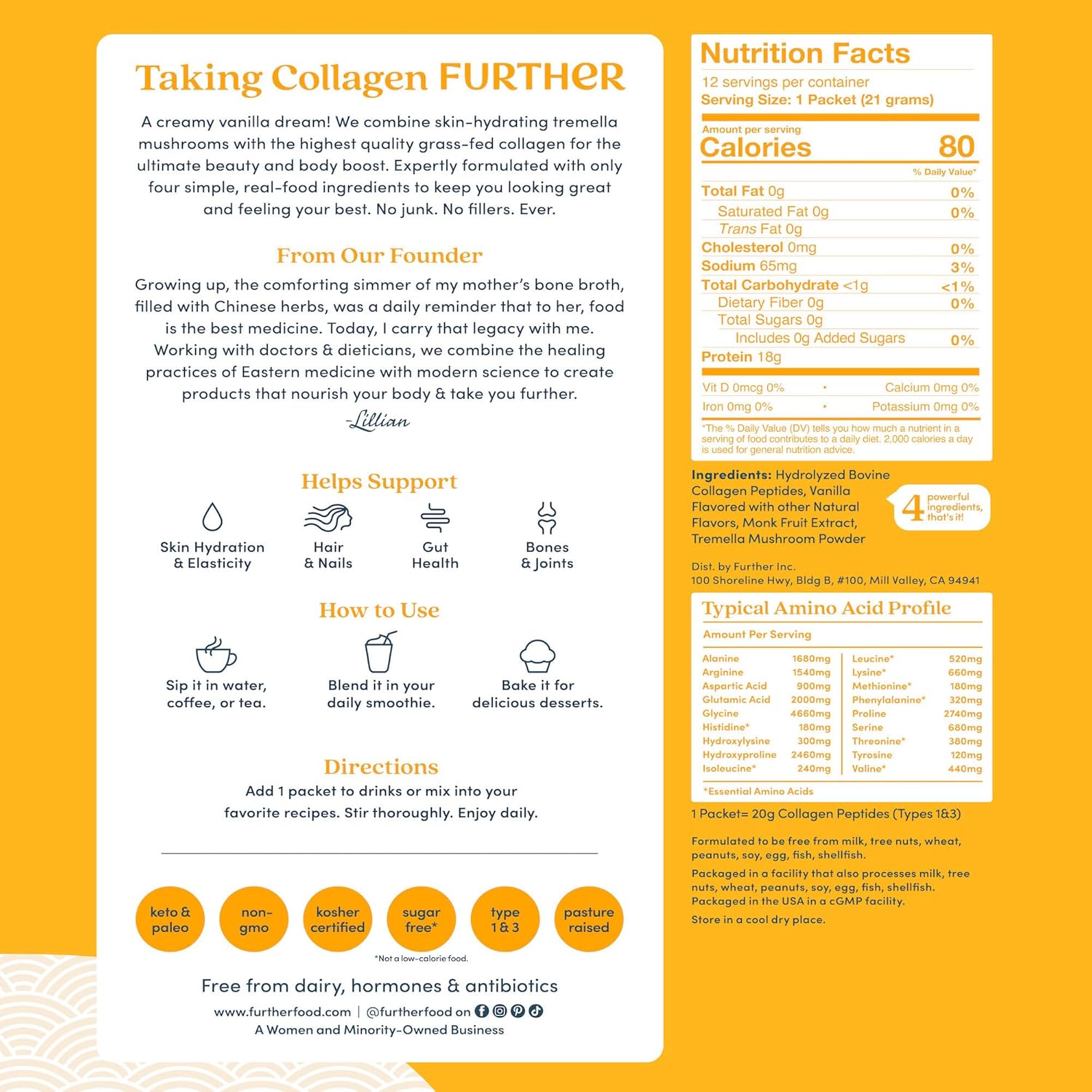 Further Food Vanilla Collagen Peptides Powder Stick Packs, Grass-Fed Pasture-Raised Hydrolyzed Type 1 & 3 Protein, Gut Health + Joint, Hair, Skin, Nails, Paleo Keto Sugar-Free 8.89 oz