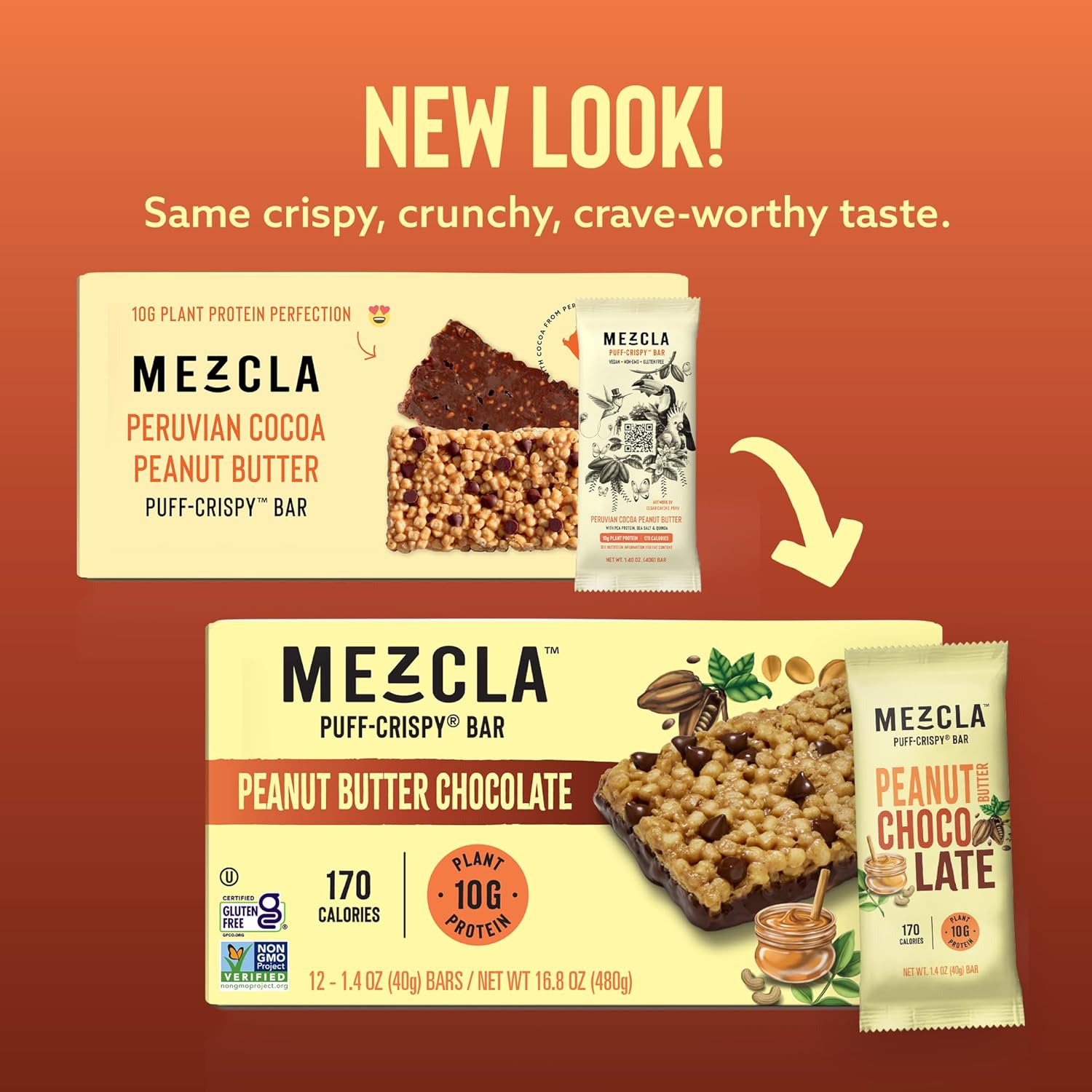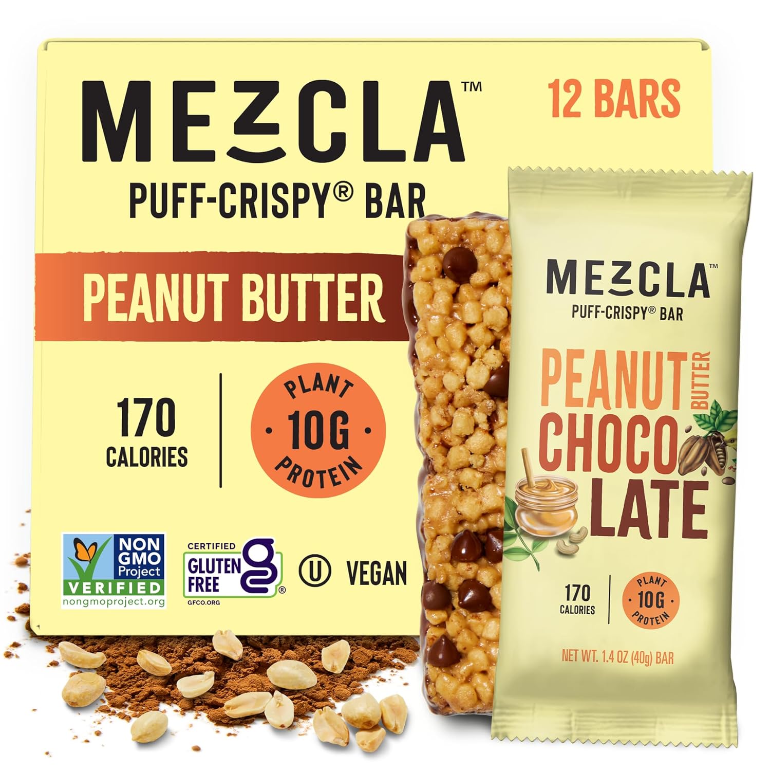 Mezcla Puff Crispy Protein Bars, Gluten Free & Vegan Protein Bars, 10g Protein, Alt for Crispy Rice Treat, Granola Bars & Breakfast Bars, Healthy Snacks for Adults, Peanut Butter Chocolate, 12 Pack