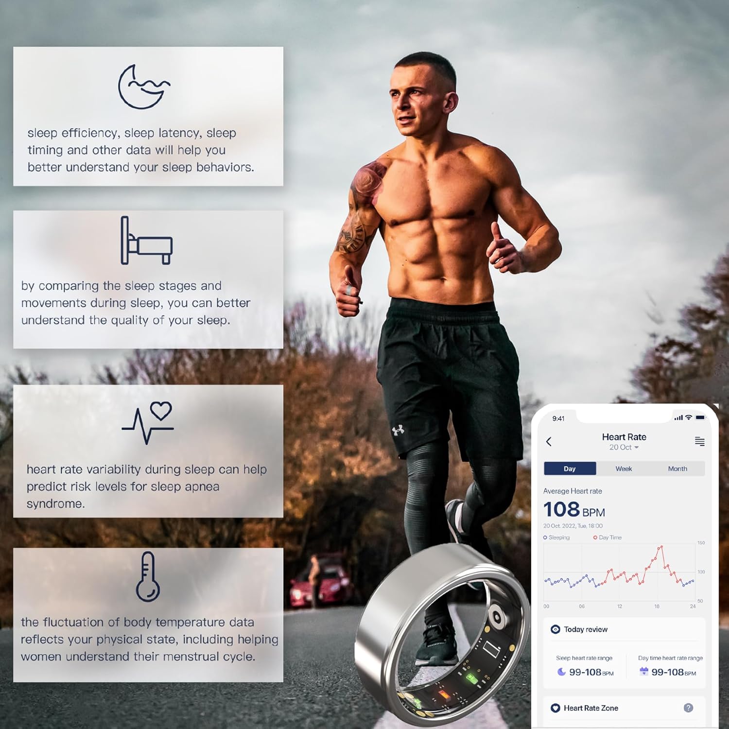 - 💓【Insightful Sleep Analysis with Smart Ring】- The Smart Ring offers a comprehensive Sleep Index, aiding in the understanding of distinct sleep stages such as Deep Sleep, REM Sleep, Light Sleep, and Awake periods. These stages coordinate various metabolic processes crucial for bodily growth, repair, restoration, and maintenance during different phases of sleep.