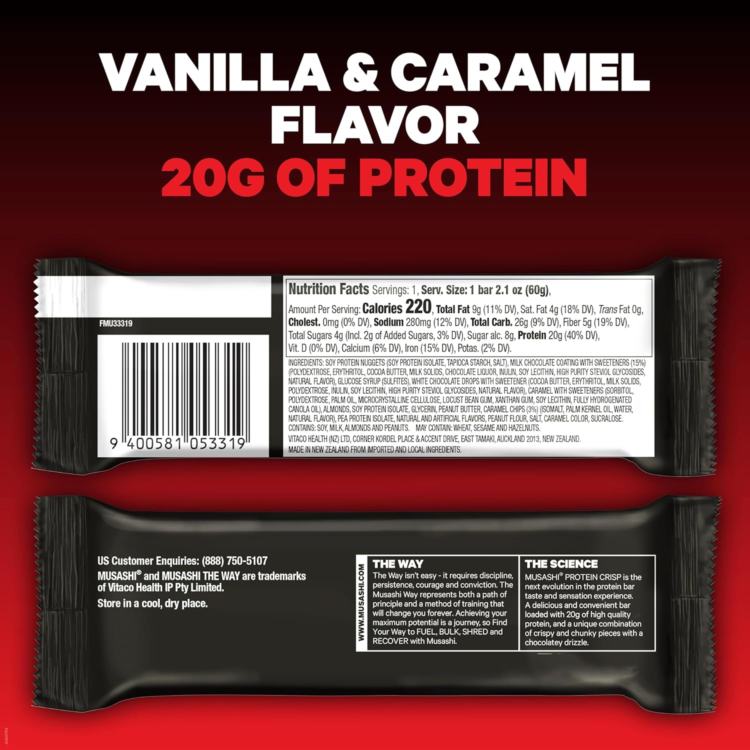 MUSASHI Protein Crisp Bar, 20g Protein, 4g Total Sugars, Vanilla & Caramel, Post Workout and Snack On The Go, 12 Pack of 2.1oz (60g) Bars