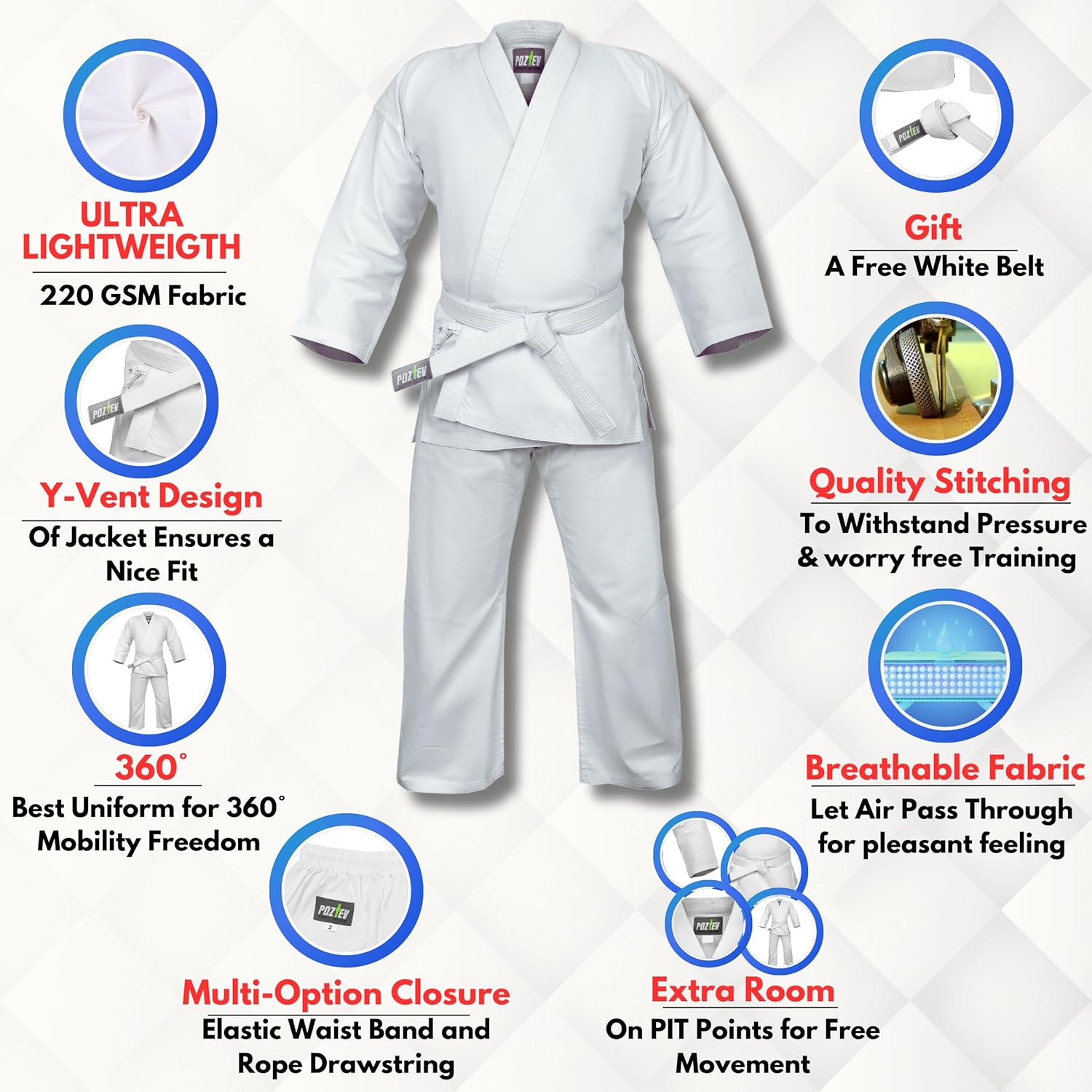 - LIGHTWEIGHT WITH 360Β° MOBILITY: Our lightweight student karate gi uniforms are tailored specifically for martial arts enthusiasts, poztev karate uniform is expertly designed to enhance your performance during combat. Featuring a highly elastic waistband with a secure drawstring closure, our uniform ensures a snug and comfortable fit, allowing you to focus solely on your training and technique.
