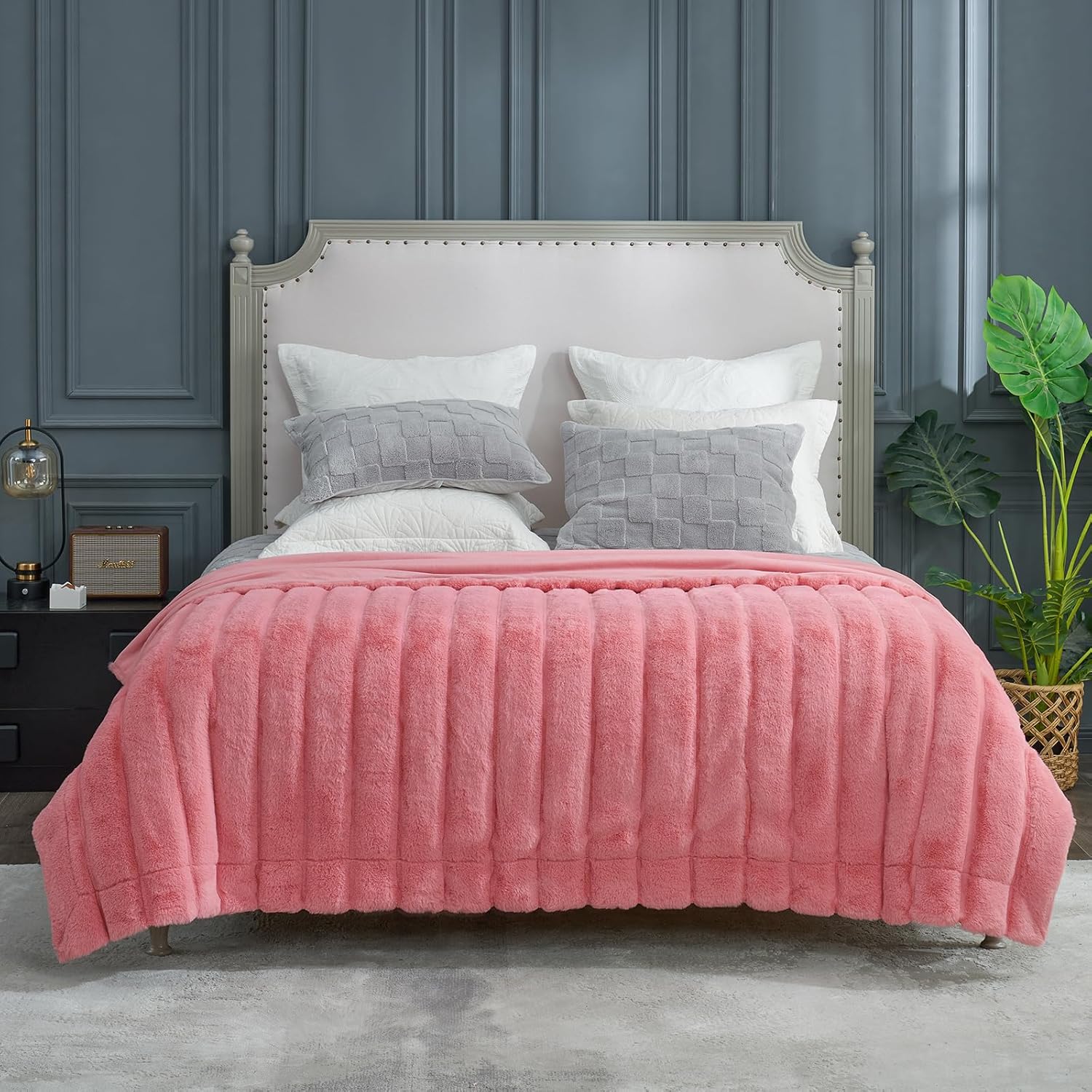 Cozy Bliss Faux Fur Throw Blanket for Couch, Cozy Warm Plush Striped Blanket for Sofa Bedroom Living Room, 90 * 90 Inches Hot Pink