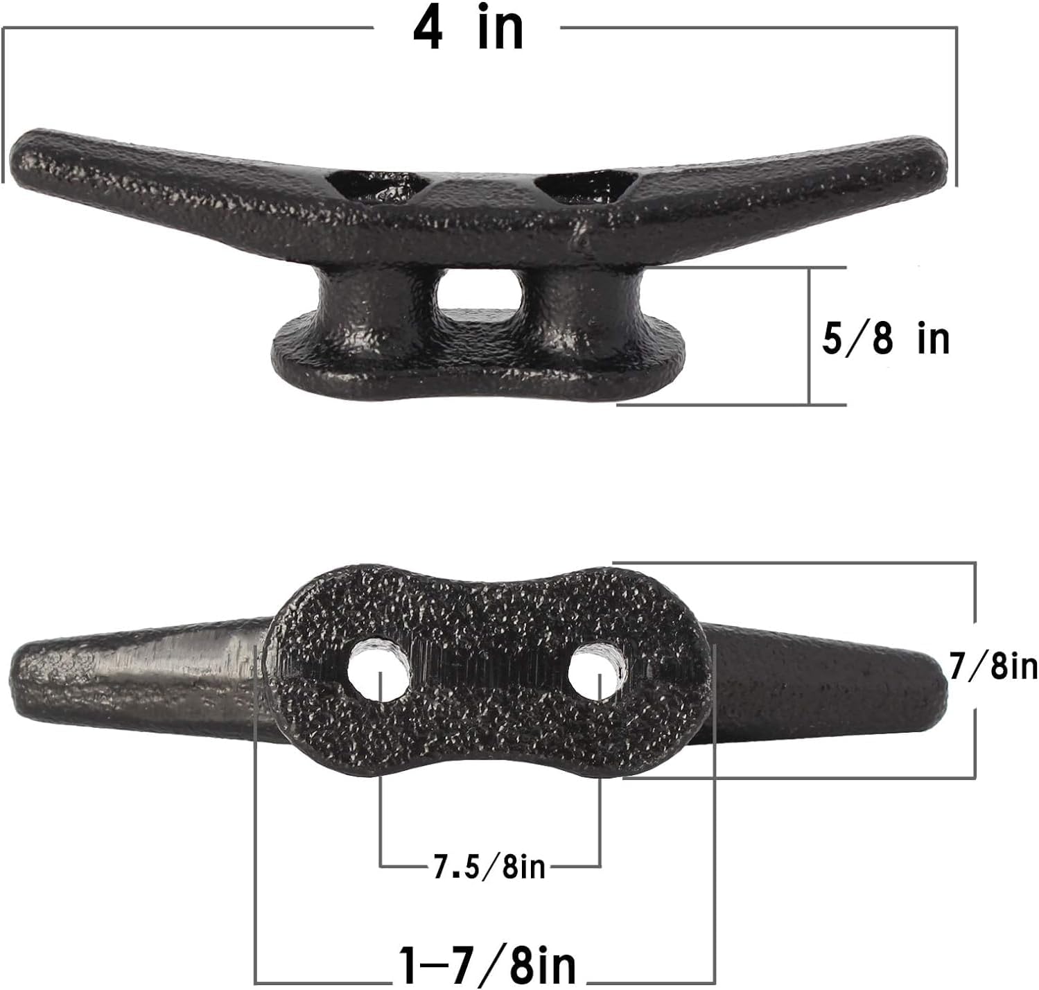 - 【Size&With Hardware】These boat dock cleats 4 inch with screws have a size of 4 inches in length and 1-1/8 inches in height, with a base measuring 1-7/8 inches x 7/8 inches. cleats for boats the mounting holes are spaced 7.5/8 inches center to center. The dock cleats come with hardware, including M5x1.57 inch stainless steel screws. black boat cleats are compatible with a wide range of boat materials, easily installed to boat decks, docks, or other structures