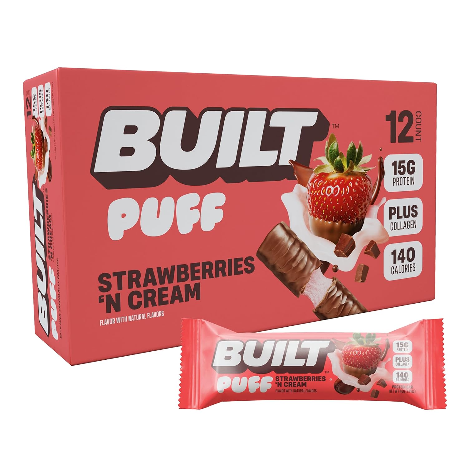 Built Bar, Puff Protein Bars, Strawberries 'N Cream Puff, 15g Protein Snacks, On-The-Go Bars, Only 140 Calories, 8g Sugar, Collagen, Gluten Free, 12 Count