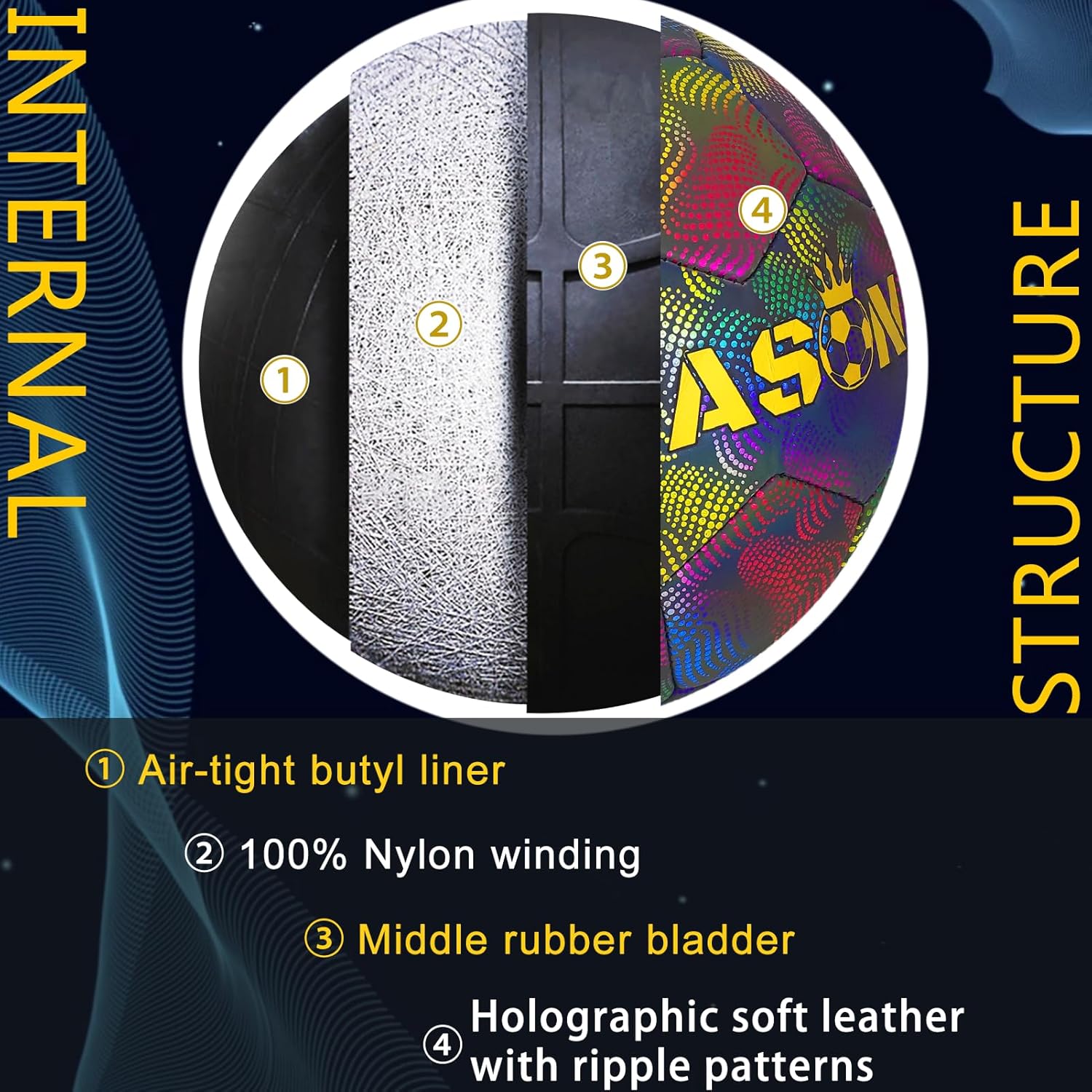 - ⚽SPECTACULAR HOLOGRAPHIC REFLECTIVE SOCCER BALL -- When light shines on the ball, new generation reflective PU leather provides the soccer ball with a shiny, holographic reflective glowing surface, captivating teens and adults. Photos or videos with your flash-on camera will get the perfect holographic effect
