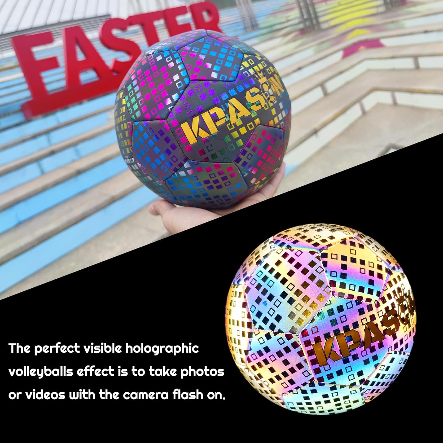 - ⚽SPECTACULAR HOLOGRAPHIC REFLECTIVE SOCCER BALL -- When light shines on the ball, new generation reflective PU leather provides the soccer ball with a shiny, holographic reflective glowing surface, captivating soccer fans and adults. Photos or videos with your flash-on camera will get the perfect holographic effect