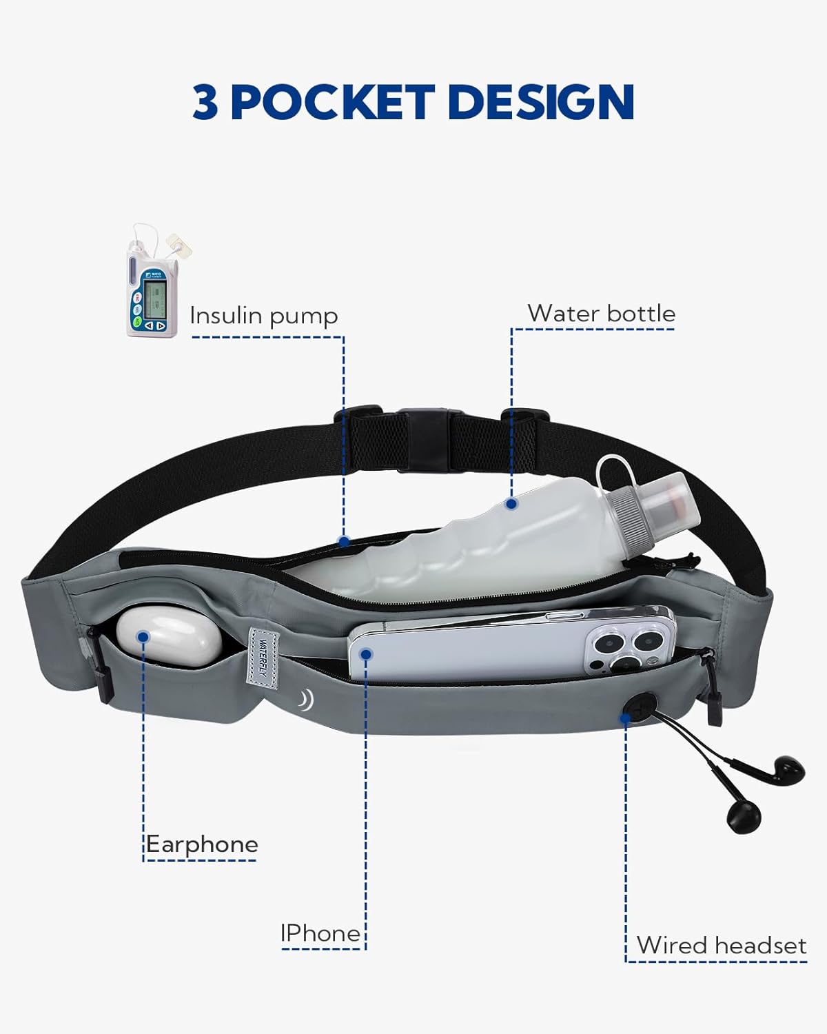 WATERFLY Running Belt Fanny Pack: Runner Marathon Jogging Waist Pack Sport Workout Exercise Fitness Phone Holder Belt for Men Women Jogger Slim Waistband Dark Grey