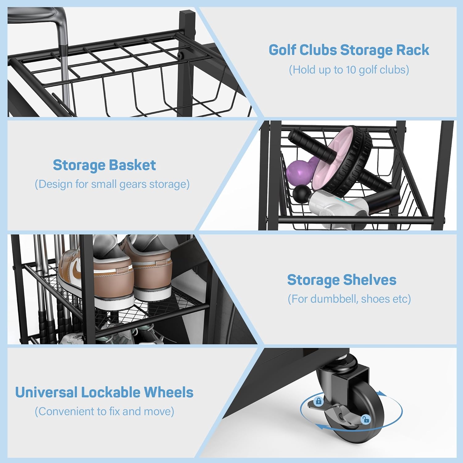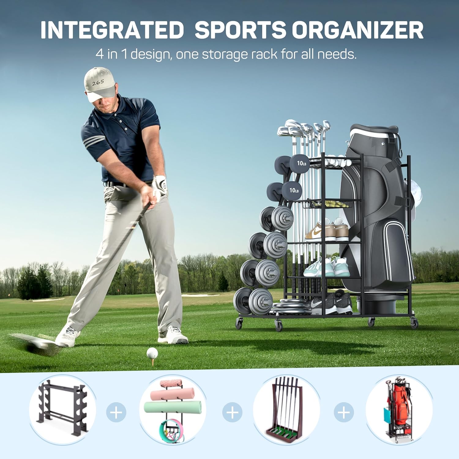 - 【Versatile Storage Solution】: This multi-functional storage rack is designed to store a variety of items, including dumbbells, kettlebells, yoga mats, golf bag, golf clubs and more. Perfectly organize all your workout and golfing essentials in one convenient storage unit.