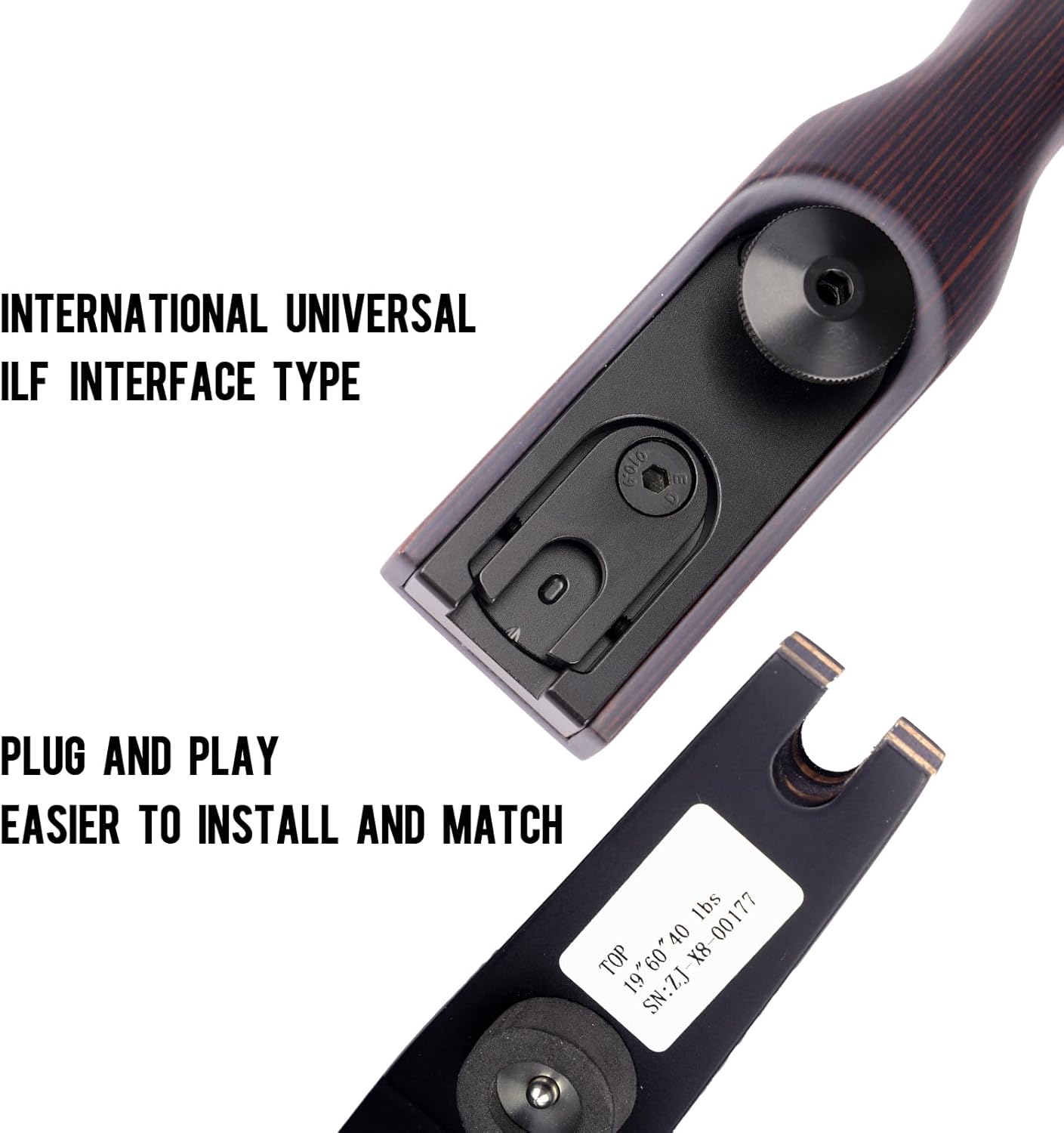 • 【Premium Materials】 Beautiful and attractive riser is crafted of Dymond wood, compact and durable. Pre installed ILF System is made of high-strength, anodised aircraft-grade Aluminium. Limbs are made of multi-layers of maple wood core and strong fiberglass, limb tips consist of laminated Bakelite, which provide stable, strong and durable shooting experience. Powerful 18 strands flemish twist bowstring is made of D97 fabric material, stretch and absorb shock more effectively.