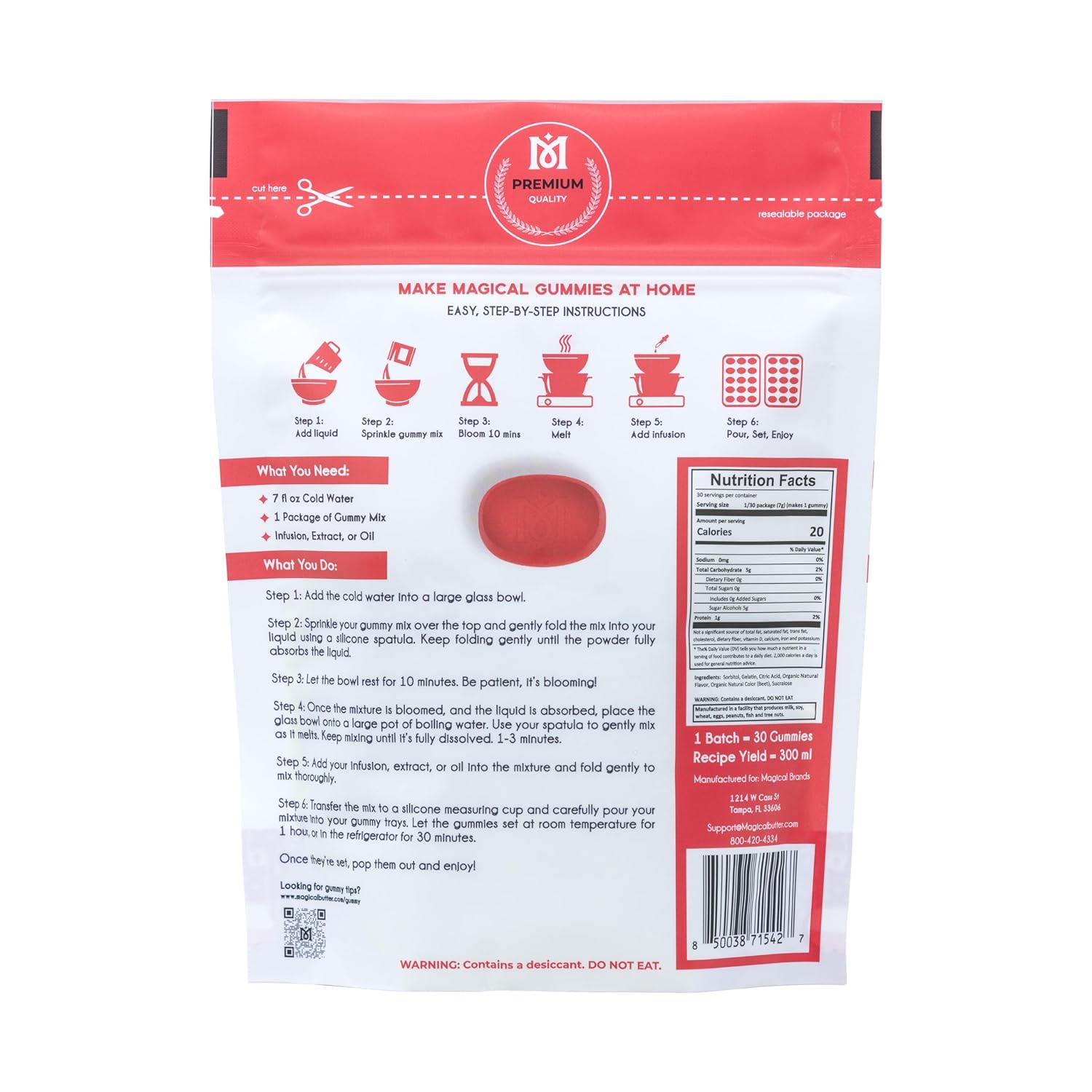 - Easy to Make: Simply add water and your infusion to the pre-measured ingredients to make up to 30 high-quality gummies per mix. The mix swells in cold water and dissolves at 140ΒΊF, ensuring an effortless preparation process.