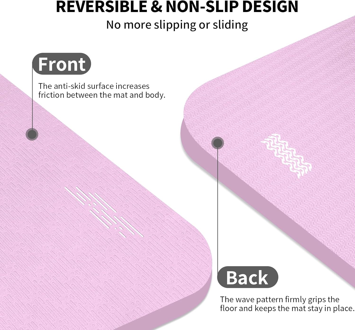 - Non-slip & Reversible Design: The anti-skid surface increases the friction between the mat and body which can prevent your hands, knees and feet from slipping during practice. The wave patterns on back firmly grip the floor ensure the mat stay in place.