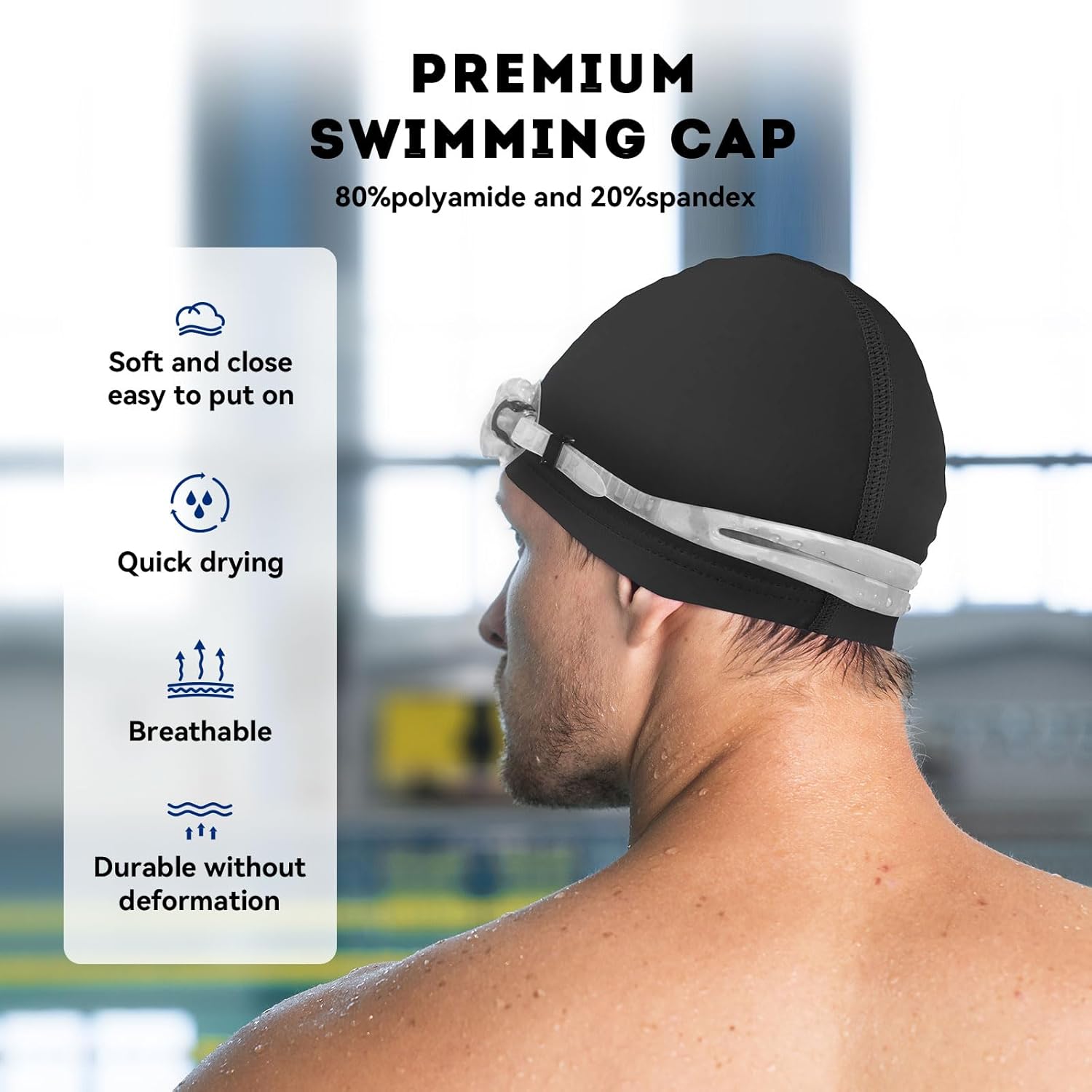 - KEEP YOUR HAIR EASILY AWAY FROM YOUR FACE: The fabric swim cap is extremely comfortable and soft, and gently touches your hair to easily separate it directly from the water, eliminating any uncomfortable pulling sensation and providing reliable hair protection. When you put on your fabric cap, you can dive into the water with confidence, knowing that your hair will be protected and that it won't flit around and interfere with your performance.NON-WATERPROOF