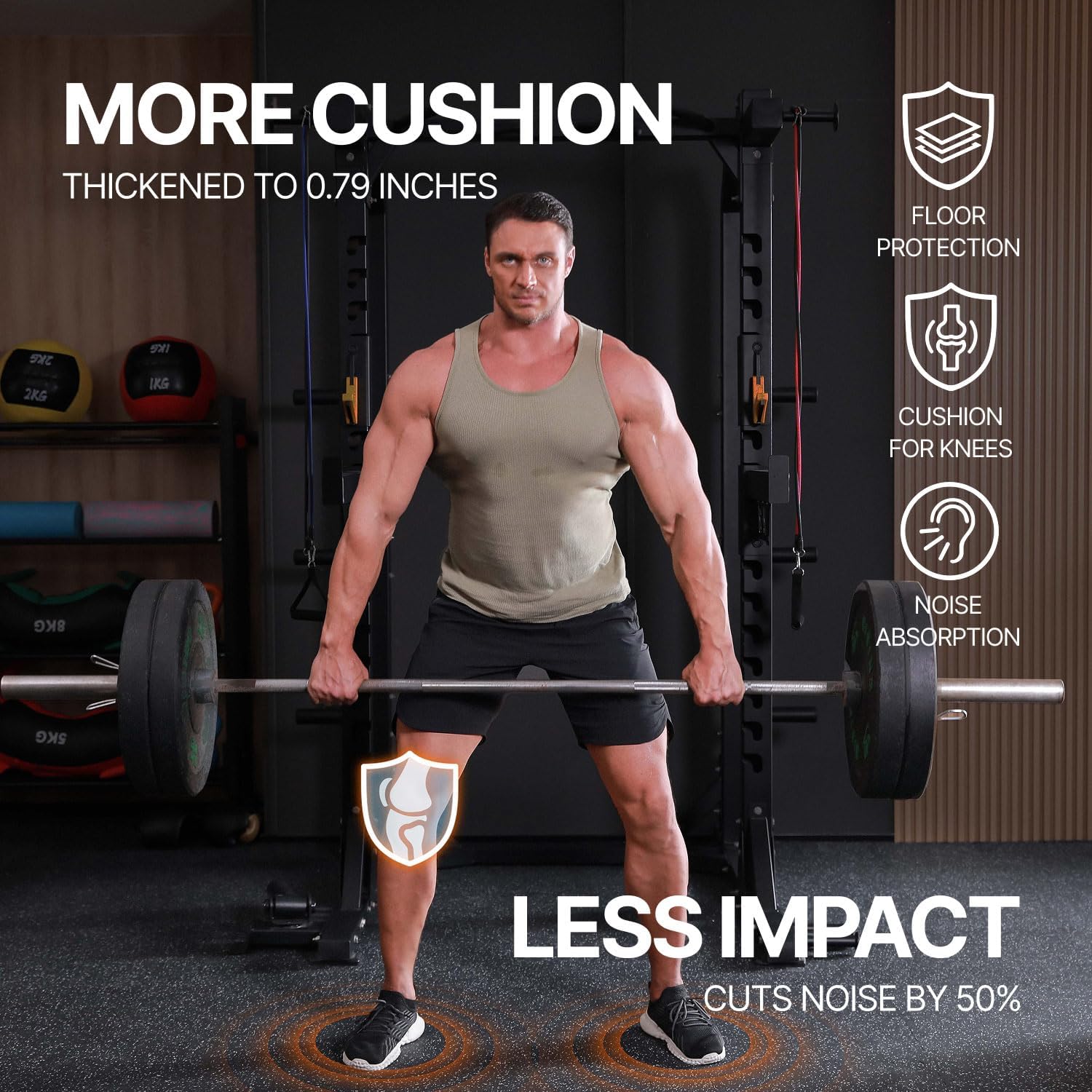 - [Easy to Assemble and Detach]: 6 tiles (24" x 24" x 0.79" each), covers 24 sq ft (6 Γ 4 ft). Upgraded larger interlocking locks provide a secure fit, preventing any separation during use, ensuring you can work out without concerns of shifting. Simple assembly and detachment make it effortless to set up your home gym.