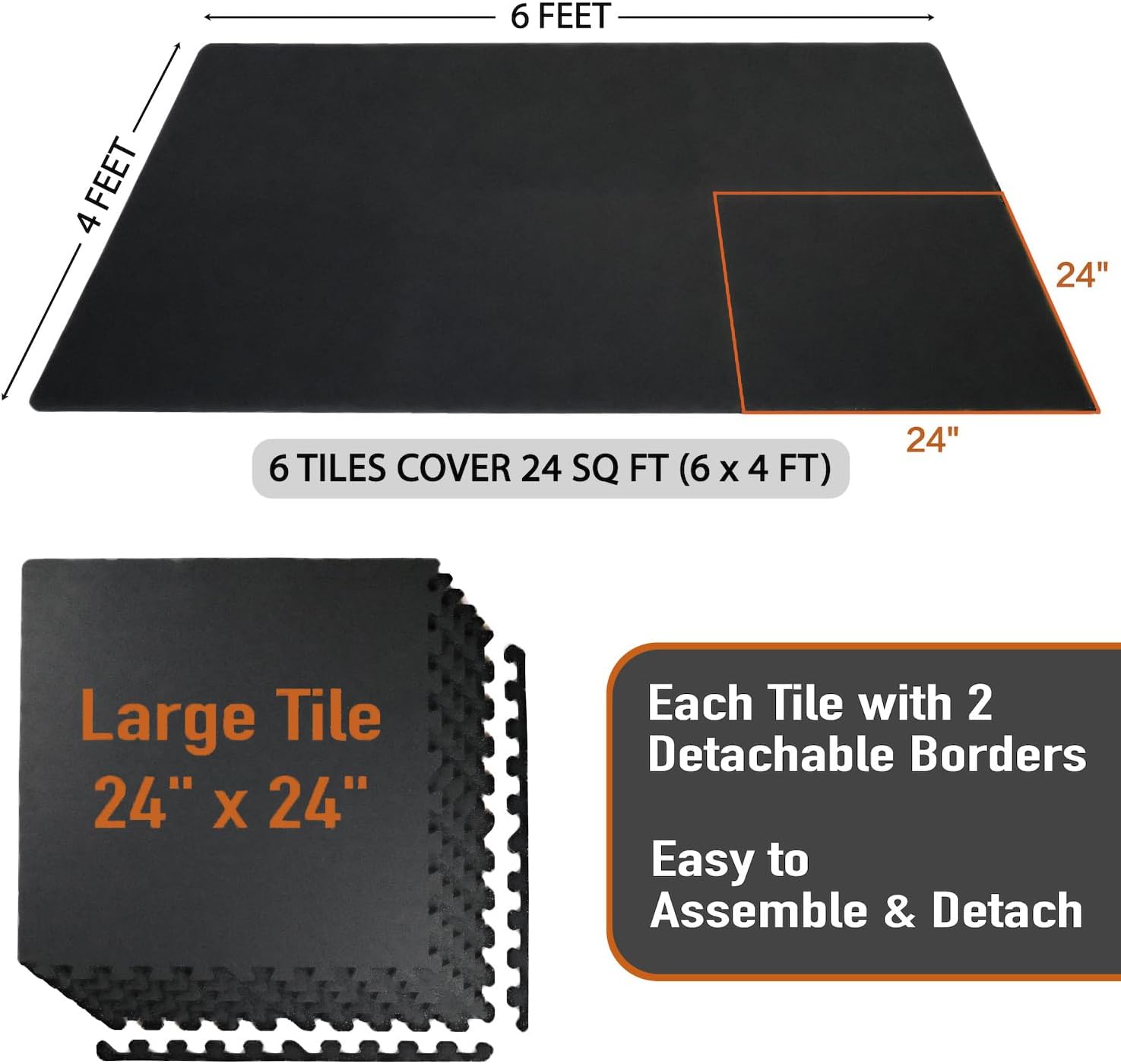 - [Easy to Assemble and Detach]: 6 tiles (24" x 24" x 0.56" each), covers 24 sq ft (6 Γ 4 ft). Upgraded larger interlocking locks provide a secure fit, preventing any separation during use, ensuring you can work out without concerns of shifting. Simple assembly and detachment make it effortless to set up your home gym.