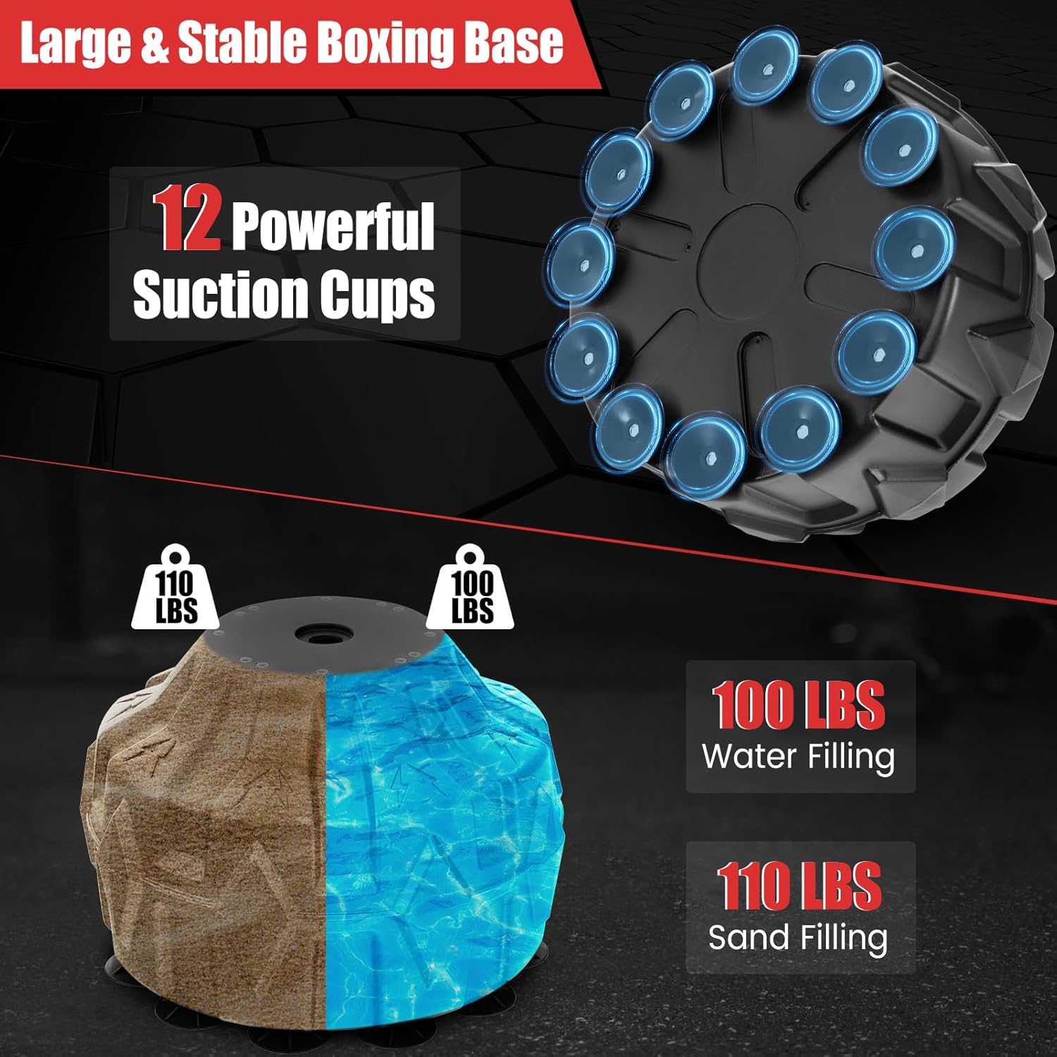- 【Freestanding with Base】Can be filled with 110 lbs sand or 100 lbs of water, this stably standing boxing bag needs no hanger or attachments. Moreover, 12 powerful suction cups on bottom improve overall stability, leaving you no worries about violent boxing or kicking.
