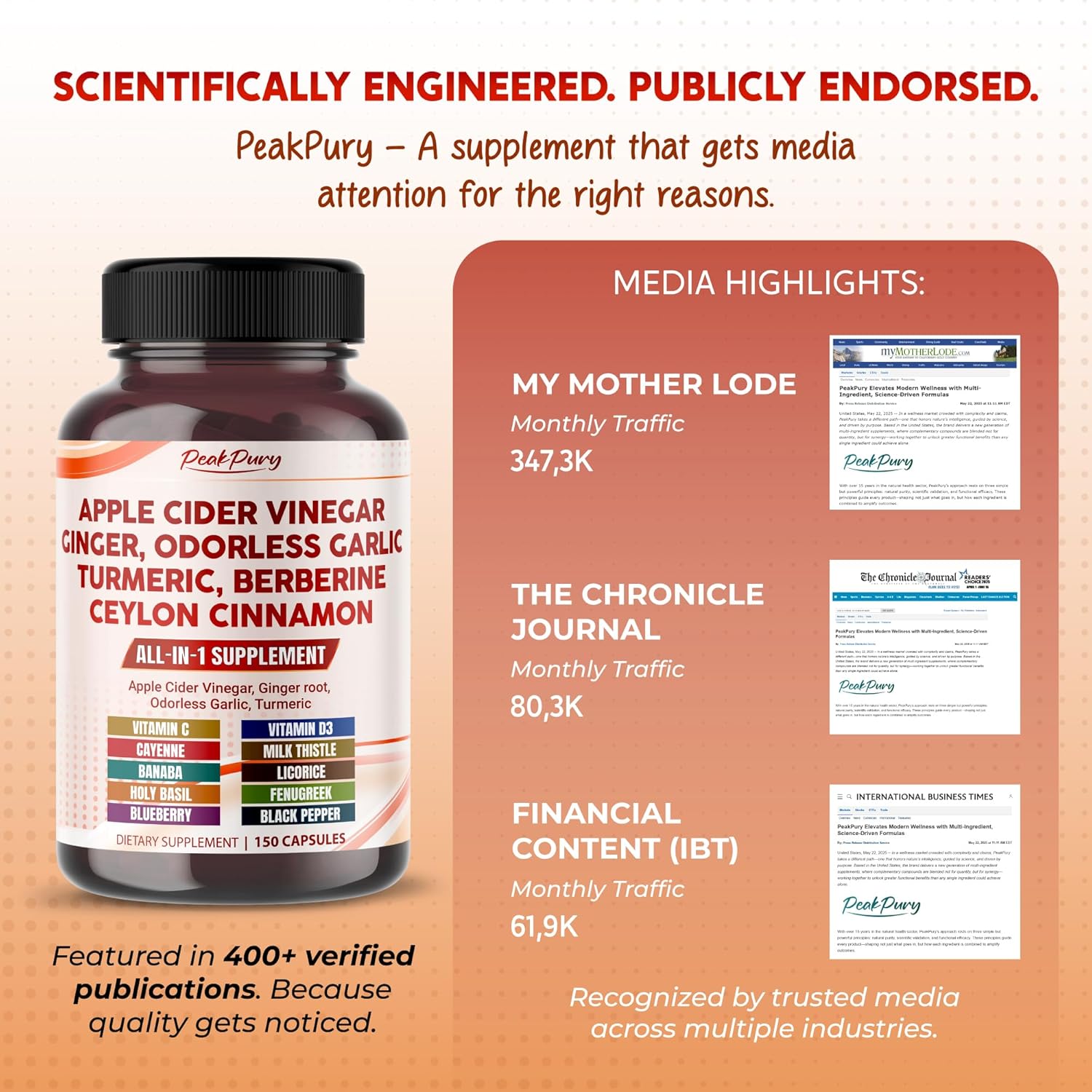 - Wellness Support: PeakPury's Apple Cider Vinegar capsules blend 16 essential ingredients, promoting circulation, digestive wellness, nutrient absorption, and holistic well being.