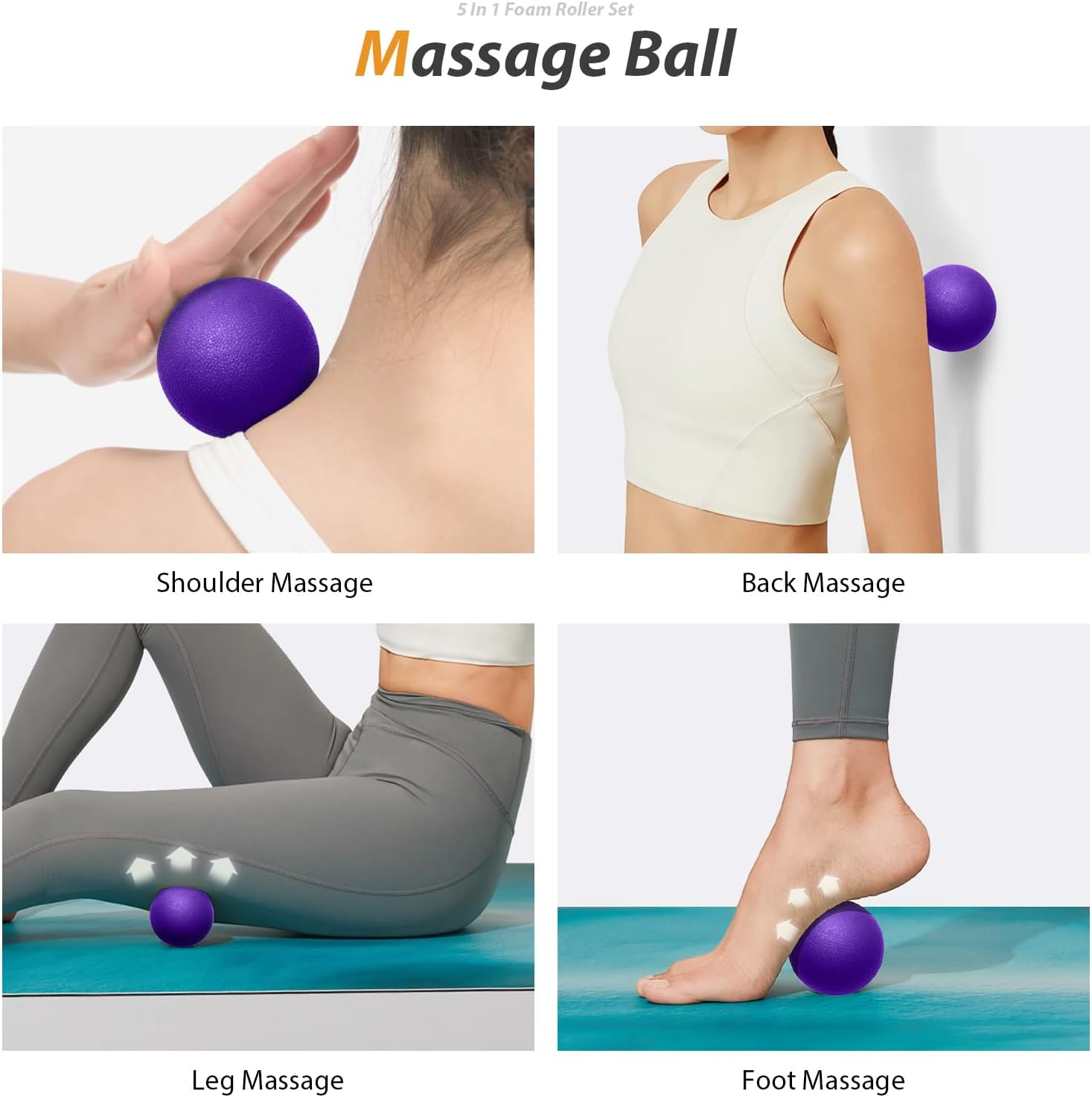 5 in 1 Foam Roller Set for Deep Tissue Muscle Massage, High Density Trigger Point Fitness Patented Exercise Foam Roller, Massage Roller, Massage Ball, Resistance Band, for Whole Body(Purple)