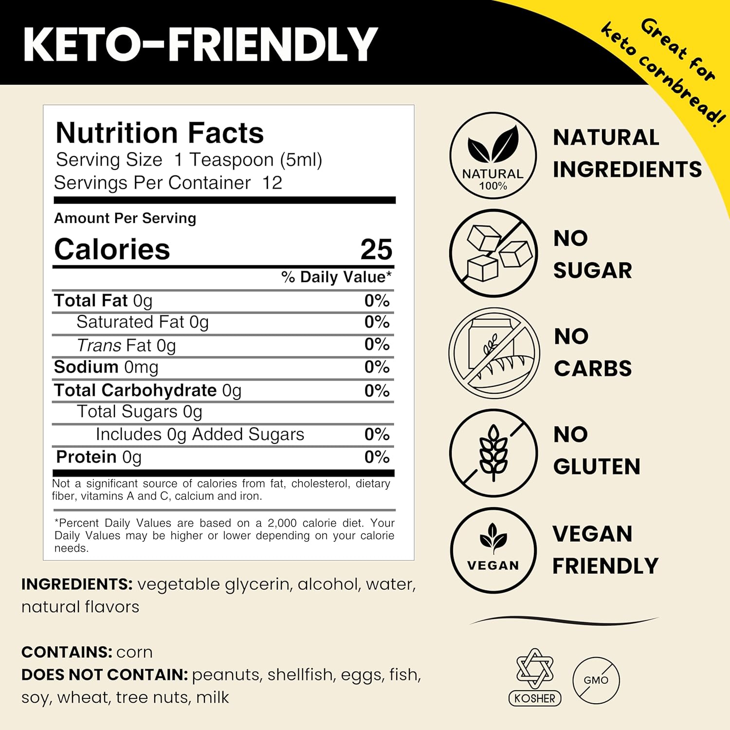 - HEALTHY CHOICE: Keto-Friendly, No Sugar, No Carbohydrates, Gluten-Free, Alcohol-Free, No Artificial Ingredients, Vegan, Preservative-Free, Non-GMO, Kosher. It's the perfect corn extract for baking keto cornbread!