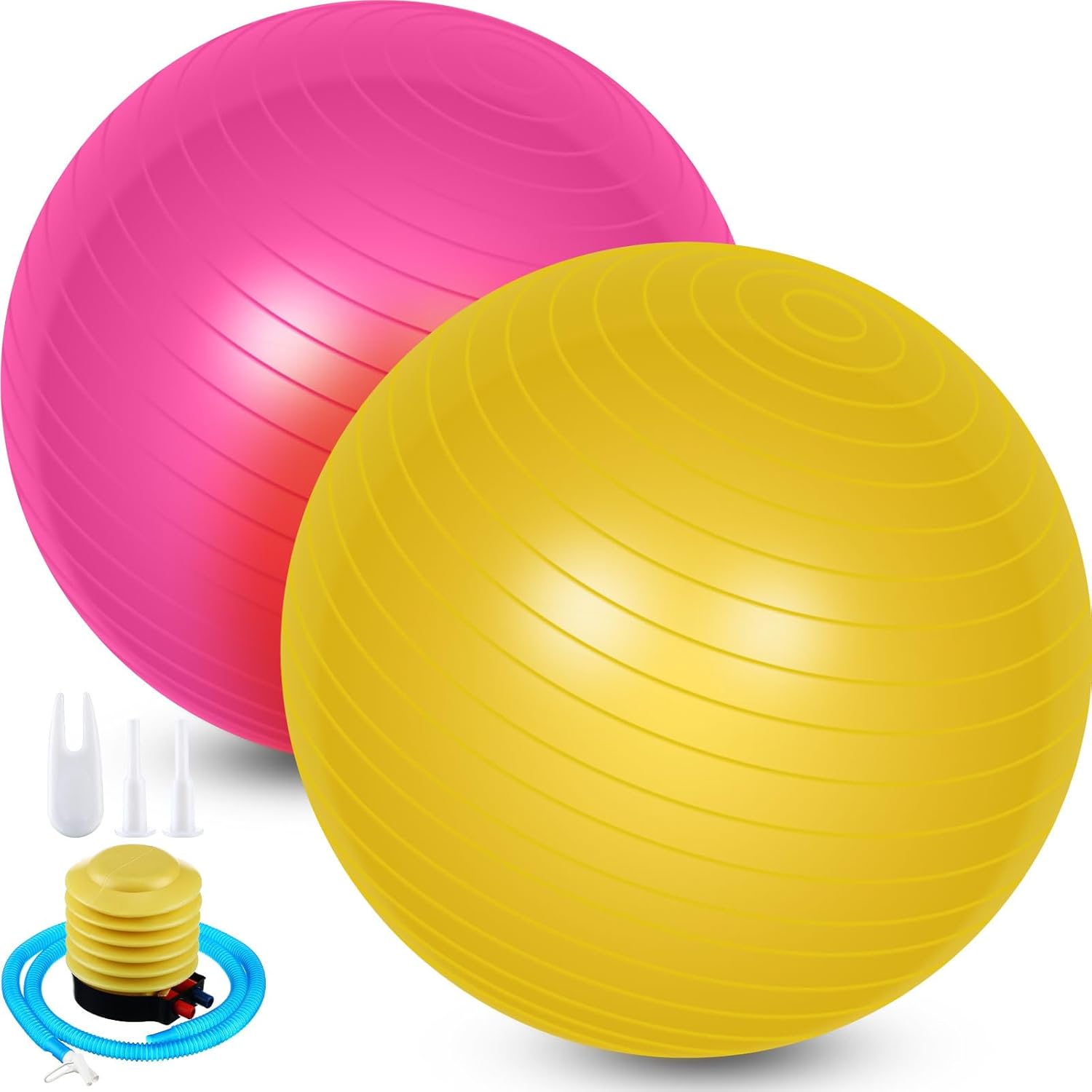- Items Sent to You: you'll get 2 different colors of gym balls: pink and yellow, each measuring about 26 inches/ 65 cm in diameter, along with 1 piece of quick inflating foot pump, 1 piece of plug removal tool and 2 pieces of air plugs for easy inflating and deflating