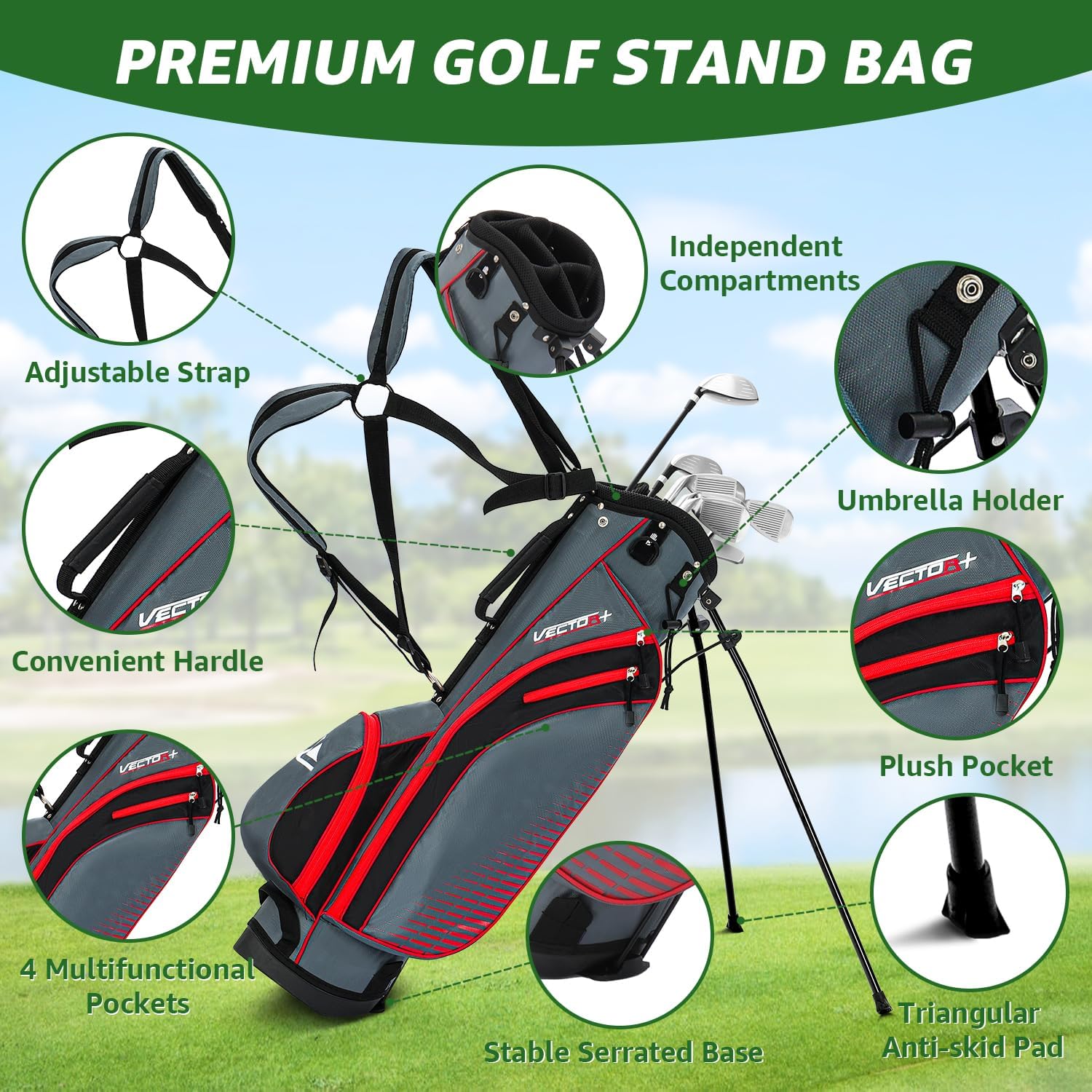 - Lightweight Stand Bag with Rain Hood: Lightweight and premium carry bag features adjustable shoulder straps, rugged handle top, numerous pockets and stable stand for convenient use. You can steadily put the bag on the ground while playing golf. With the extra pockets, some items can be well stored