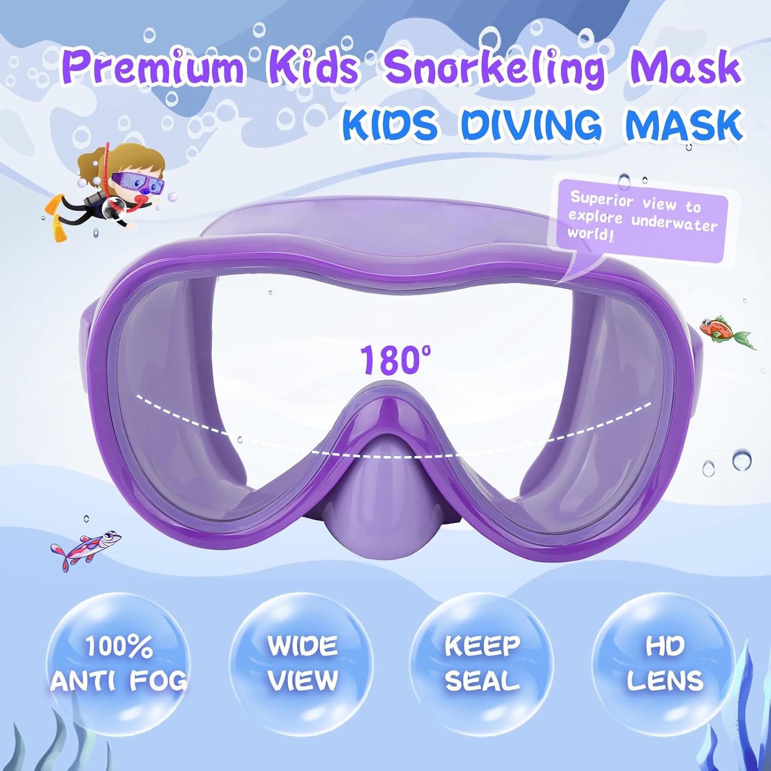 - 【2025 Upgraded Anti-shattered Kid Swim Mask】 Designed for kids swimming, snorkeling or diving, 180 ° clear vision, more comfortable elastic knitted strap than silicone headbands, one-third lighter than the traditional diving mask, a soft nose cover, upgraded polycarbonate anti-fog lens, provides your kids panoramic & clear vision underwater. These are great for help build kid's confidence underwater and not be afraid of swimming anymore.