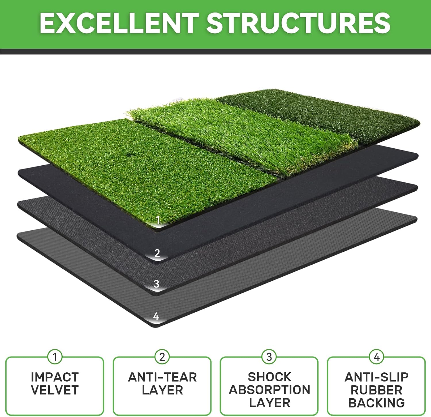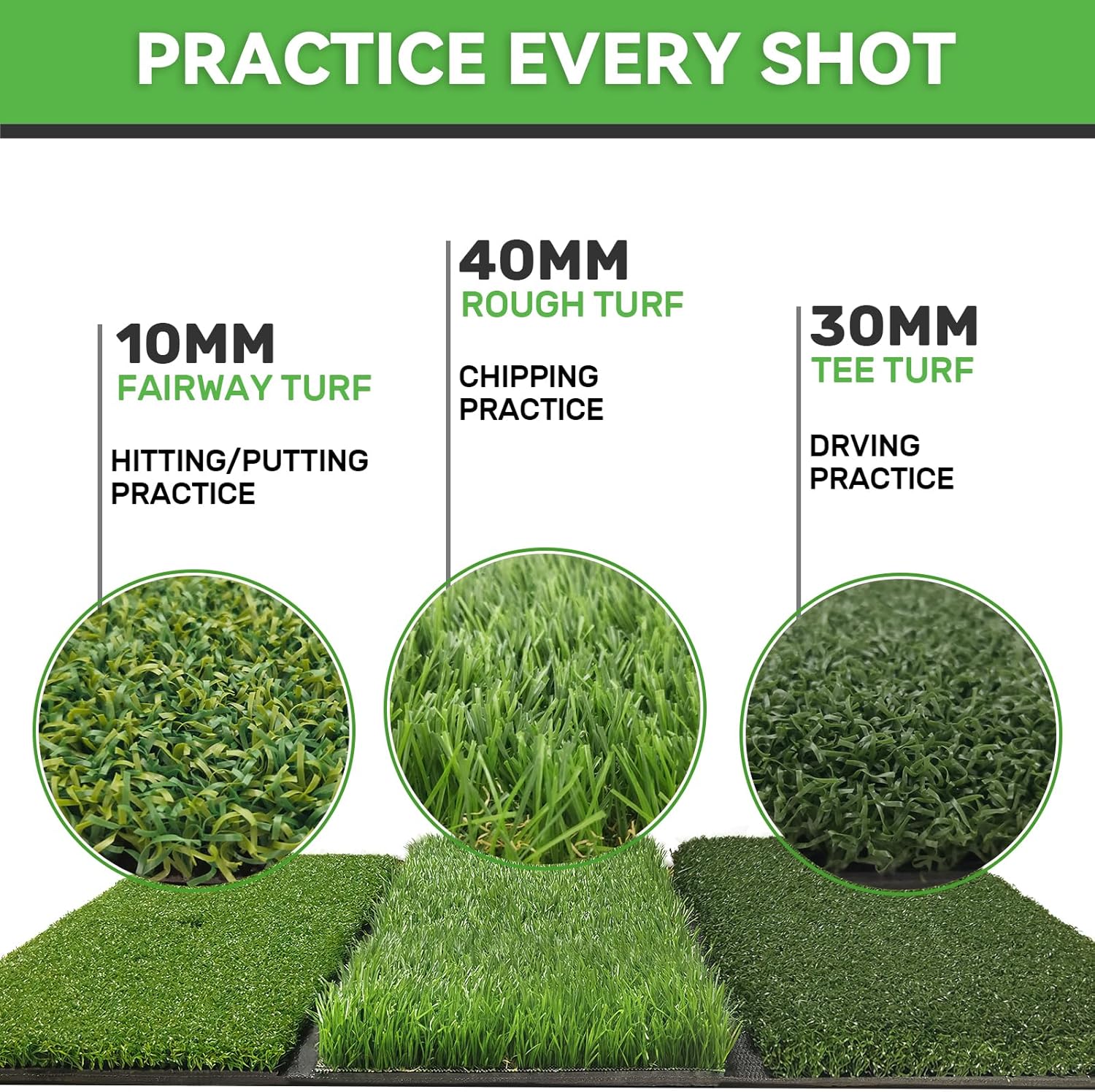 - 【Premium Material】COSPORTIC golf mats are made of three types of premium artificial turf to meet your high level of play in different golf scenarios. You can practice hitting on fairway turf, chipping on rough mat and driving on tee grass
