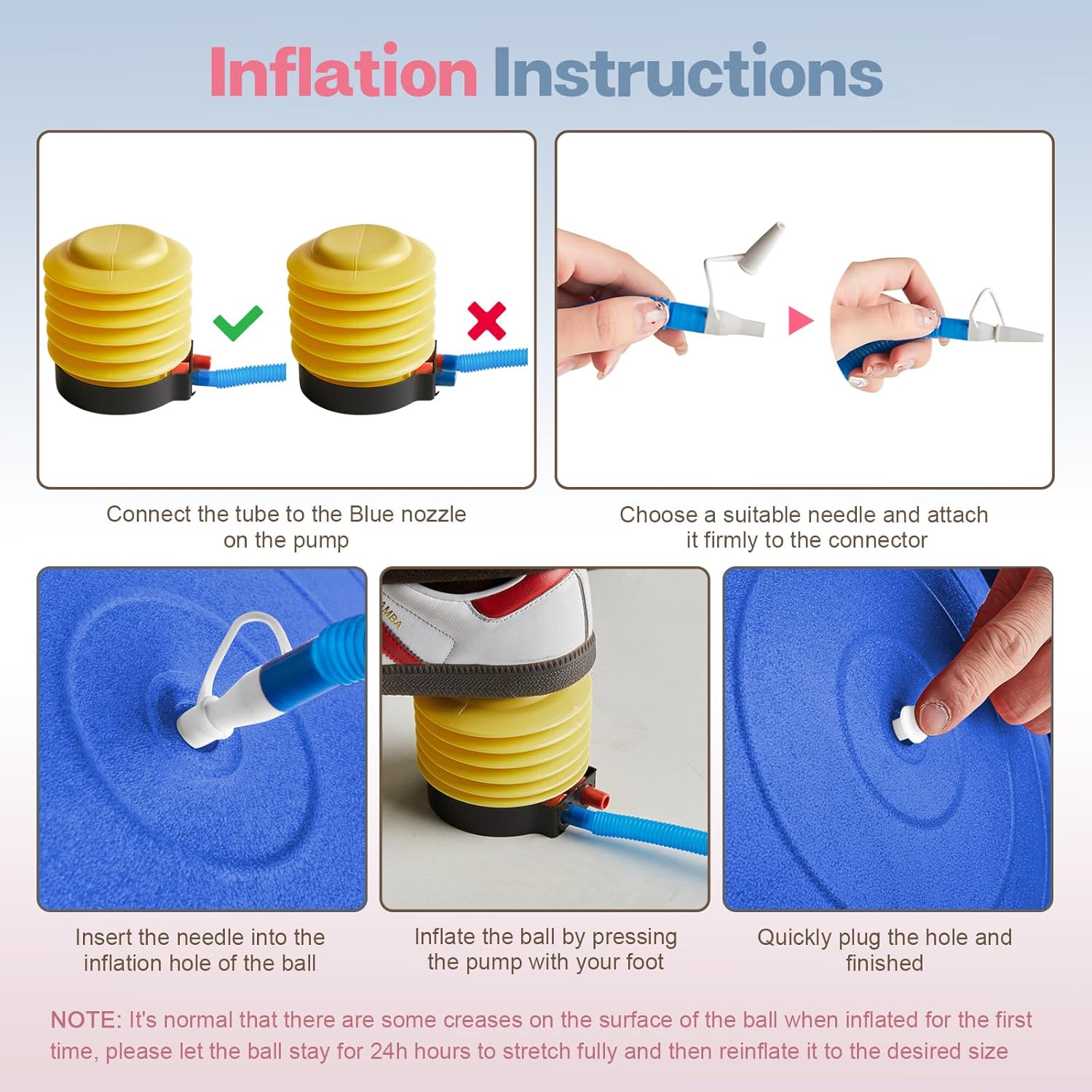 - As the exercise ball for workout is delivered deflated, you are provided with a foot pump to expedite the inflation process and make it more effortless. INFLATION INSTRUCTIONS: (It may be necessary to re-inflate your new Yoga Ball after initial inflation to allow the ball’ s material to fully stretch to its desired size. Let the ball sit for 25 hours after the initial inflation, then inflate it again to make it full.)