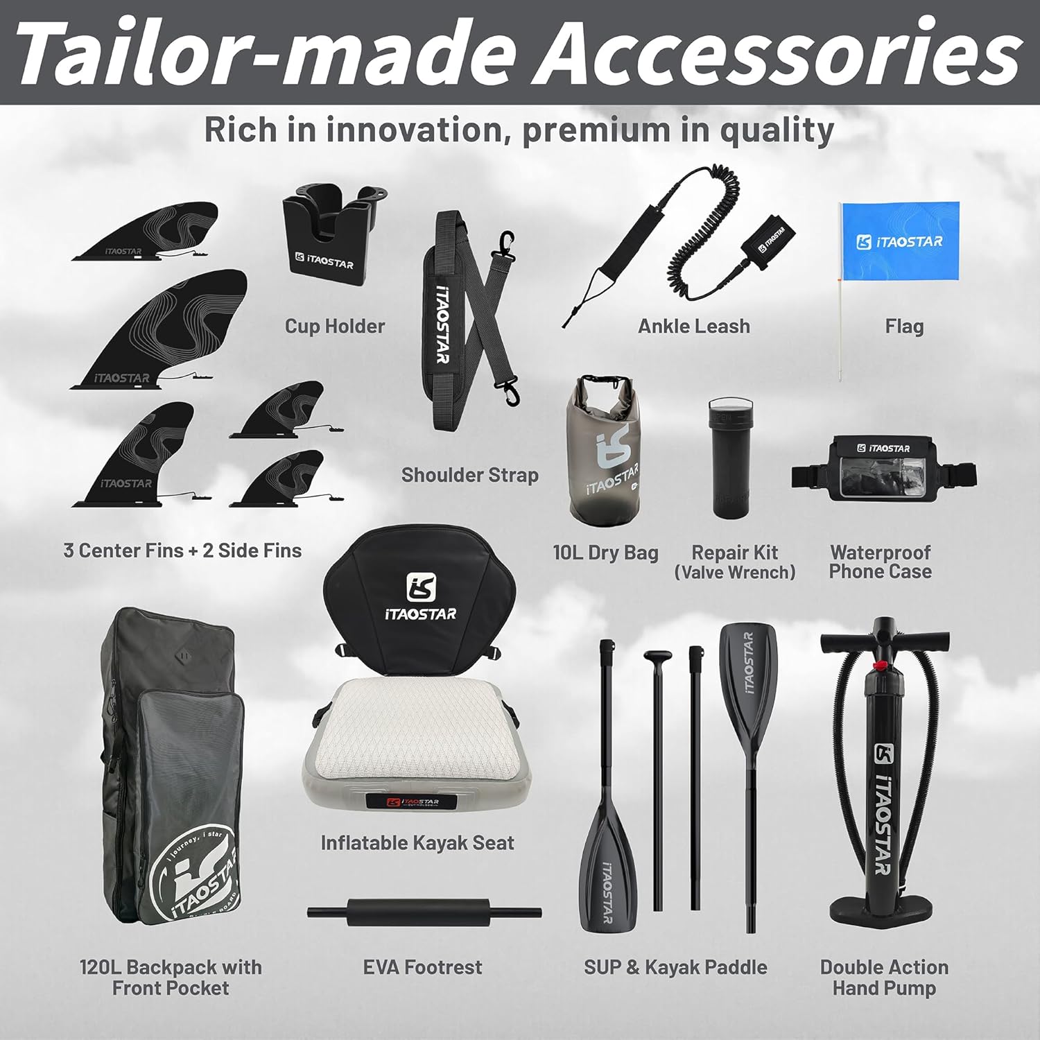 - Tailored One-Stop Accessories - Our iSUP set features more stuff than others, which include an adjustable paddle with kayak kit, 5 fins, seat, footrest, double-action pump, shoulder strap, ankle leash, waterproof pouch, 120L backpack, 10L dry bag, cup holder, flag, whistle, valve wrench, and manual