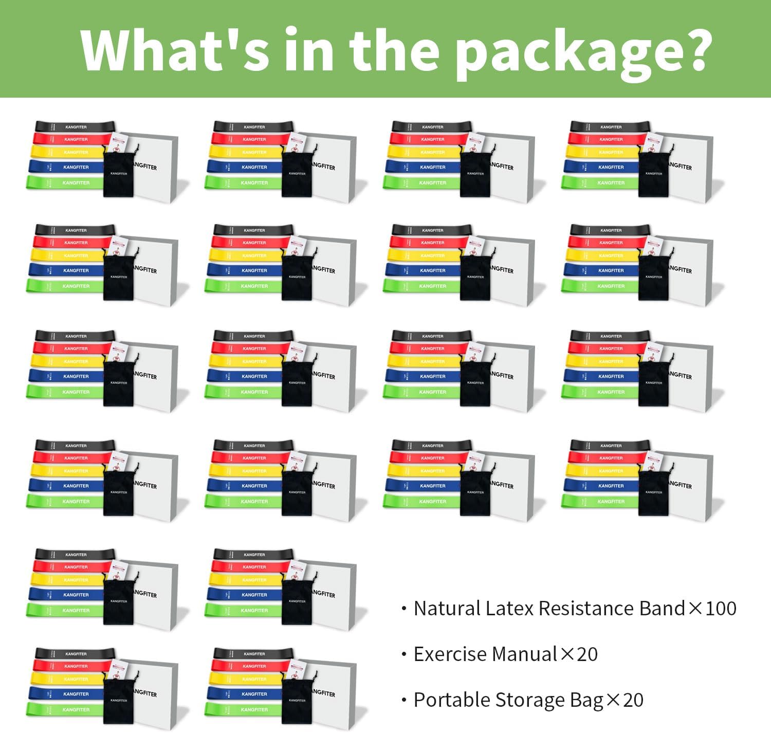 - 【WHAT YOU GET】: 100 Pcs KANGFITER resistance bands,5 pieces each set with storage bag and instruction guide.They can be provided to 20 gym members or class students and are suitable for group fitness exercises both indoors and outdoors.