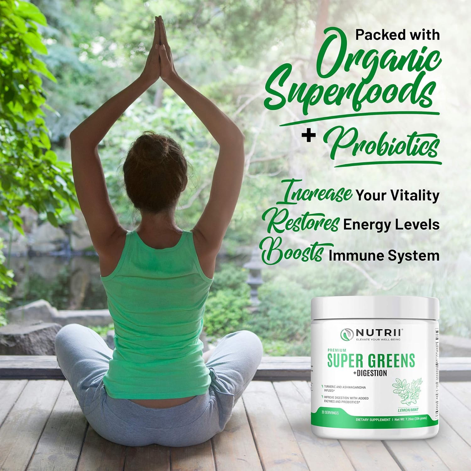 - NATURALLY ORGANIC- Nutrii Super Greens + Digestion is made with 100% organic ingredients. Our super greens powder formula is fortified with powerful enzymes, probiotics, essential vitamins, and phytonutrients.