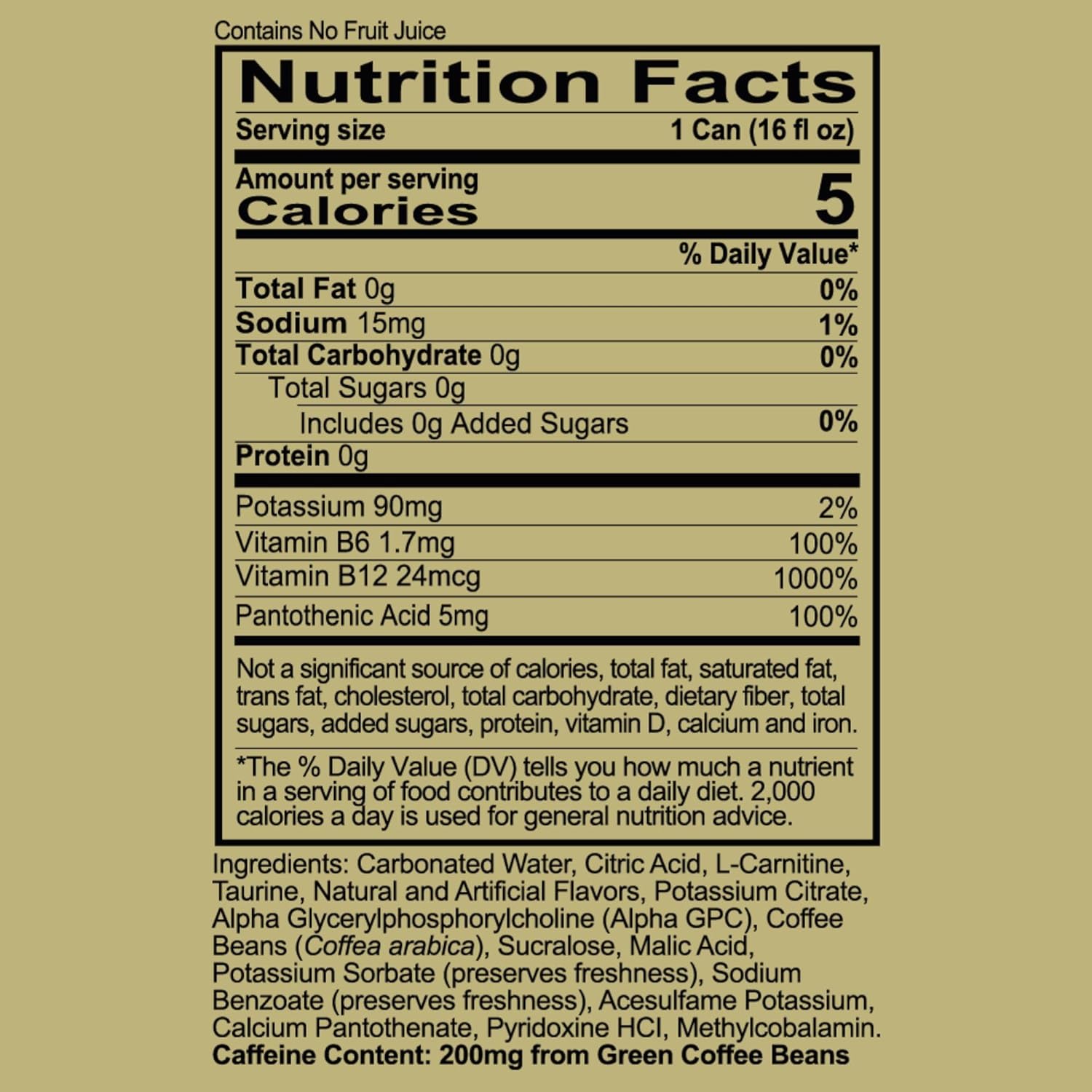 - Premium Ingredients Backed By Science - These zero sugar energy drinks contain 200mg of natural caffeine from green coffee beans, which helps promote wakefulness, as well as 1g of l-carnitine, which may help the preservation of muscle.