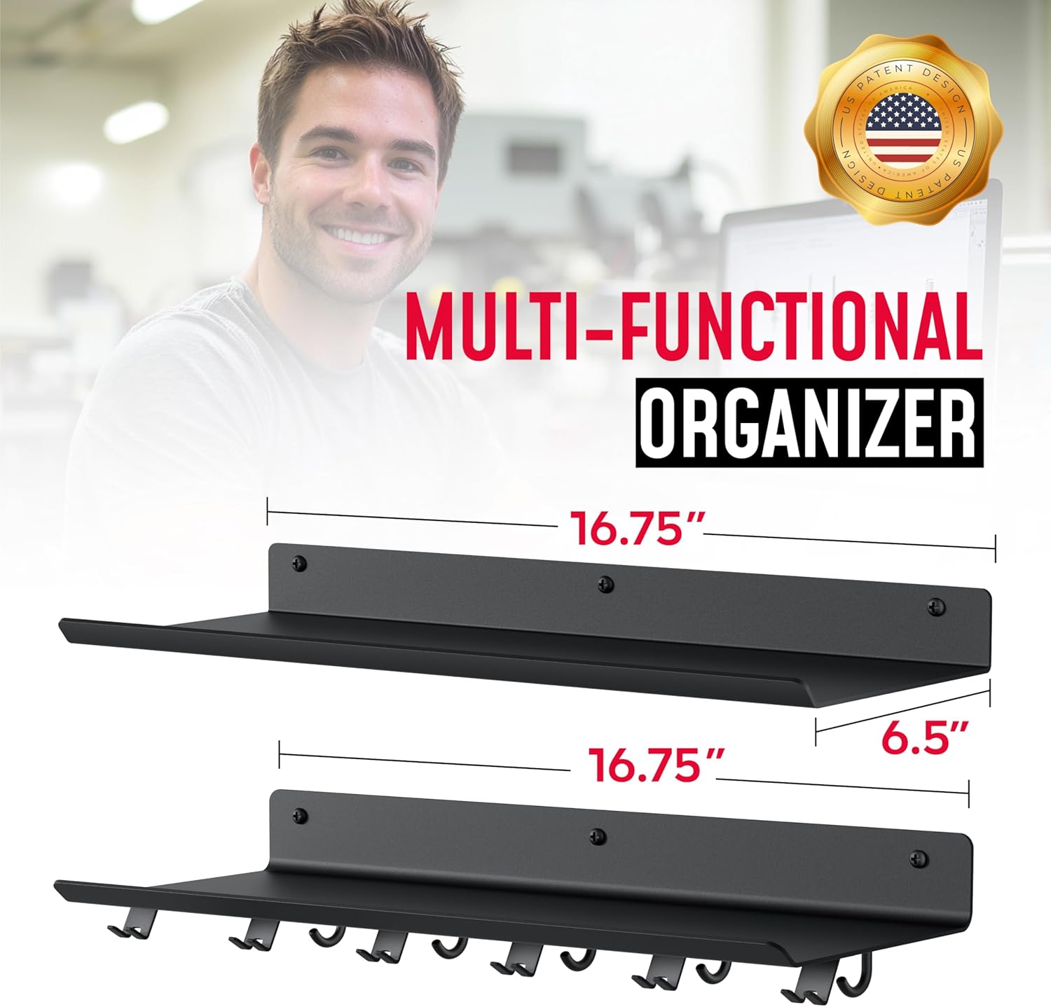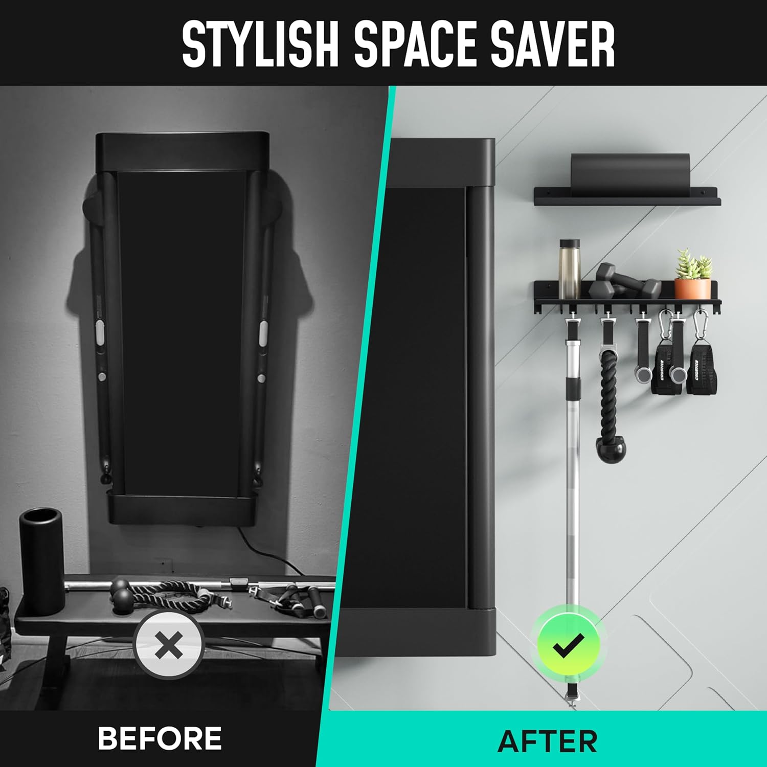 - Sturdy Functional Home Gym Shelf: Made from top-grade metal with a fully rust-resistant coating; heavy-duty wall mount rack holds various accessories safely; 3 storage zone and bottom hooks support hanging items like towels, exercise bands, bags and more