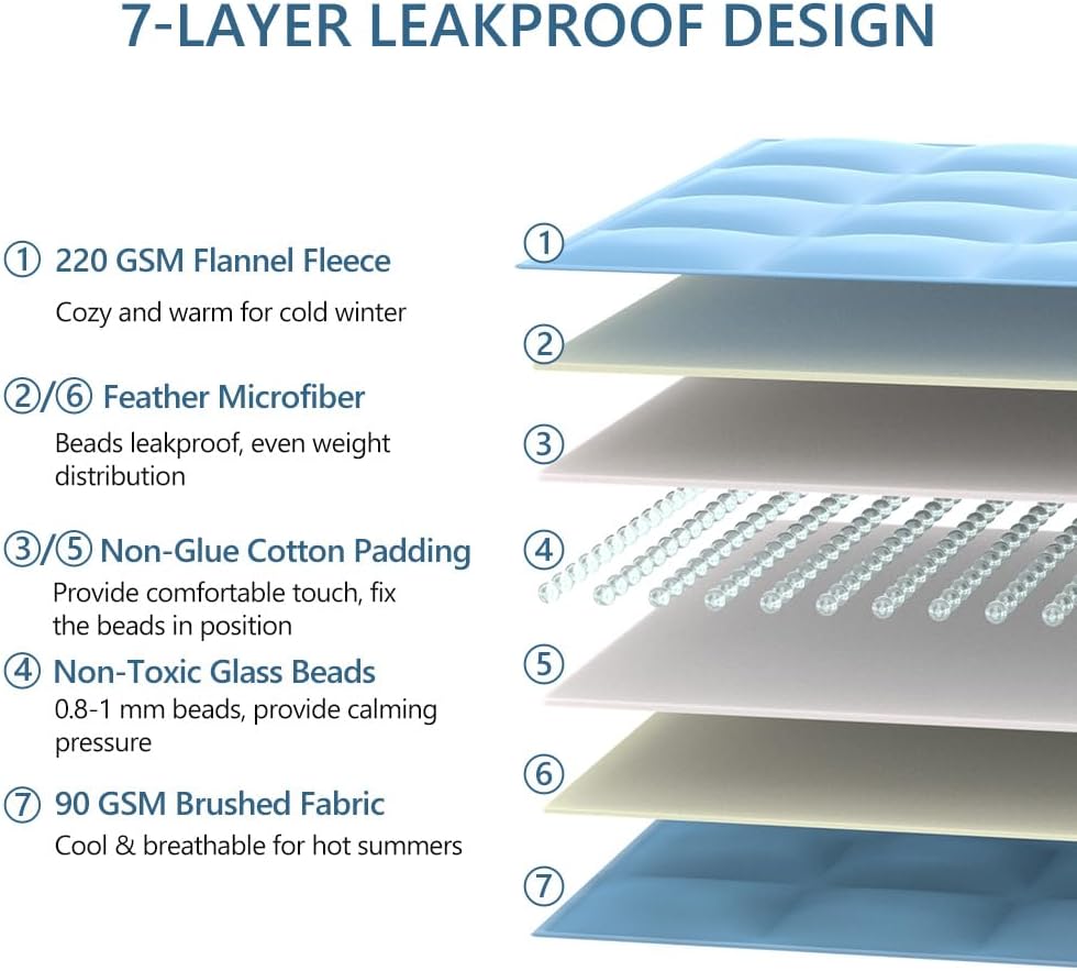 - Easily Care & Machine Washable: This 5 lb weighted blanket is easy to clean and maintain. It can be machine washed or tumble dried. We recommend washing in cold water and tumble drying or air drying on low. No bleaching or ironing is required.The 7-layer design and tight alignment stitching prevents beads from leaking, so you can use it with confidence. We provide a full range of considerate service, if you have any questions about our adult weighted blanket, you can ask us at any time