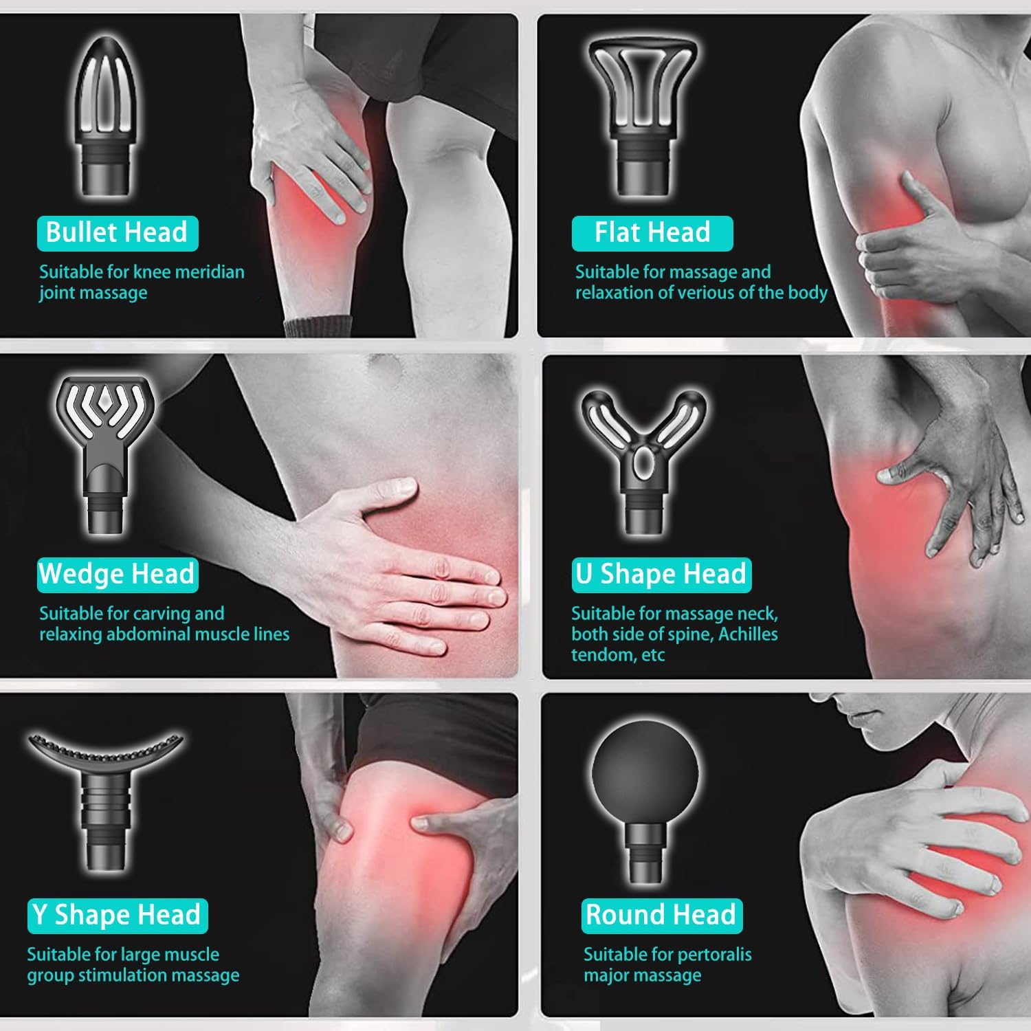 - Interchangeable Massage Heads for Versatile Use: Most muscle massage gun come with multiple interchangeable attachments, such as a ball, flat, or bullet head. These attachments are designed to target various muscle groups, enhancing the effectiveness of muscle relaxation, recovery, and pain relief.