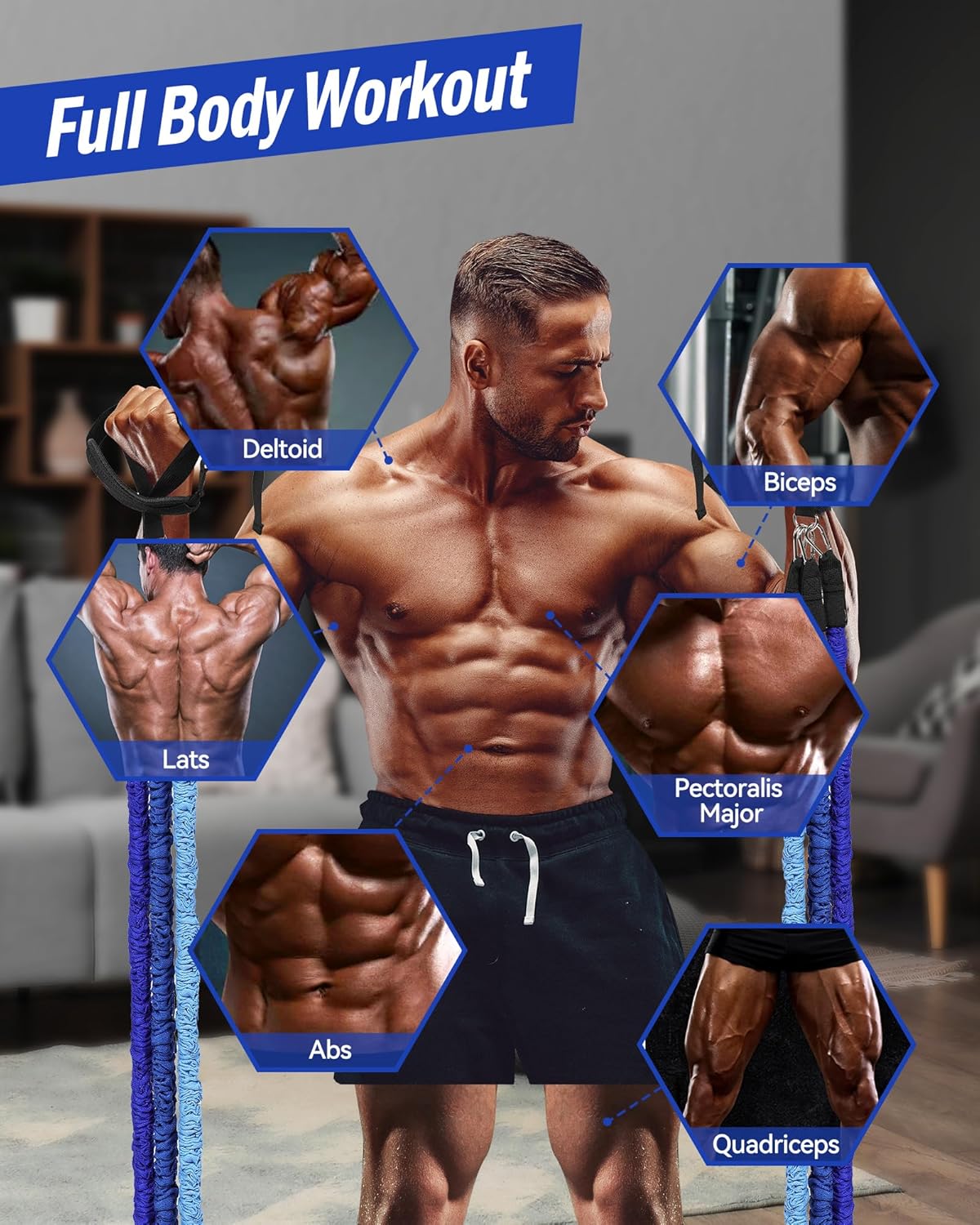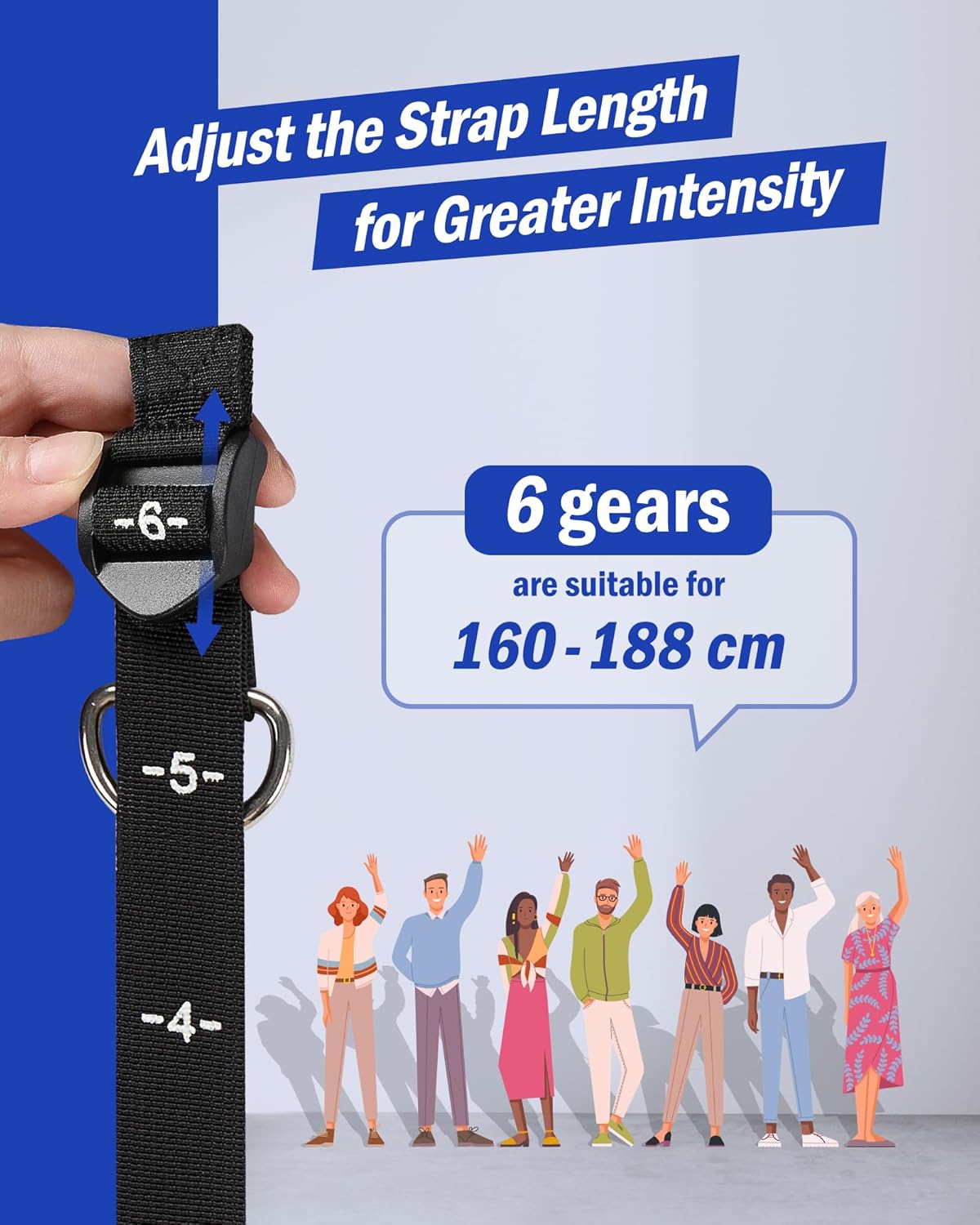 - 【Upgraded Adjustable Length】: To accommodate users of different heights, we’ve added adjustable straps with markings suitable for 5’3”-6’2”. You can adjust the length of the resistance bands scientifically to match your height. Additionally, the 2-in-1 handles feature adjustable buckles to fit various foot sizes.