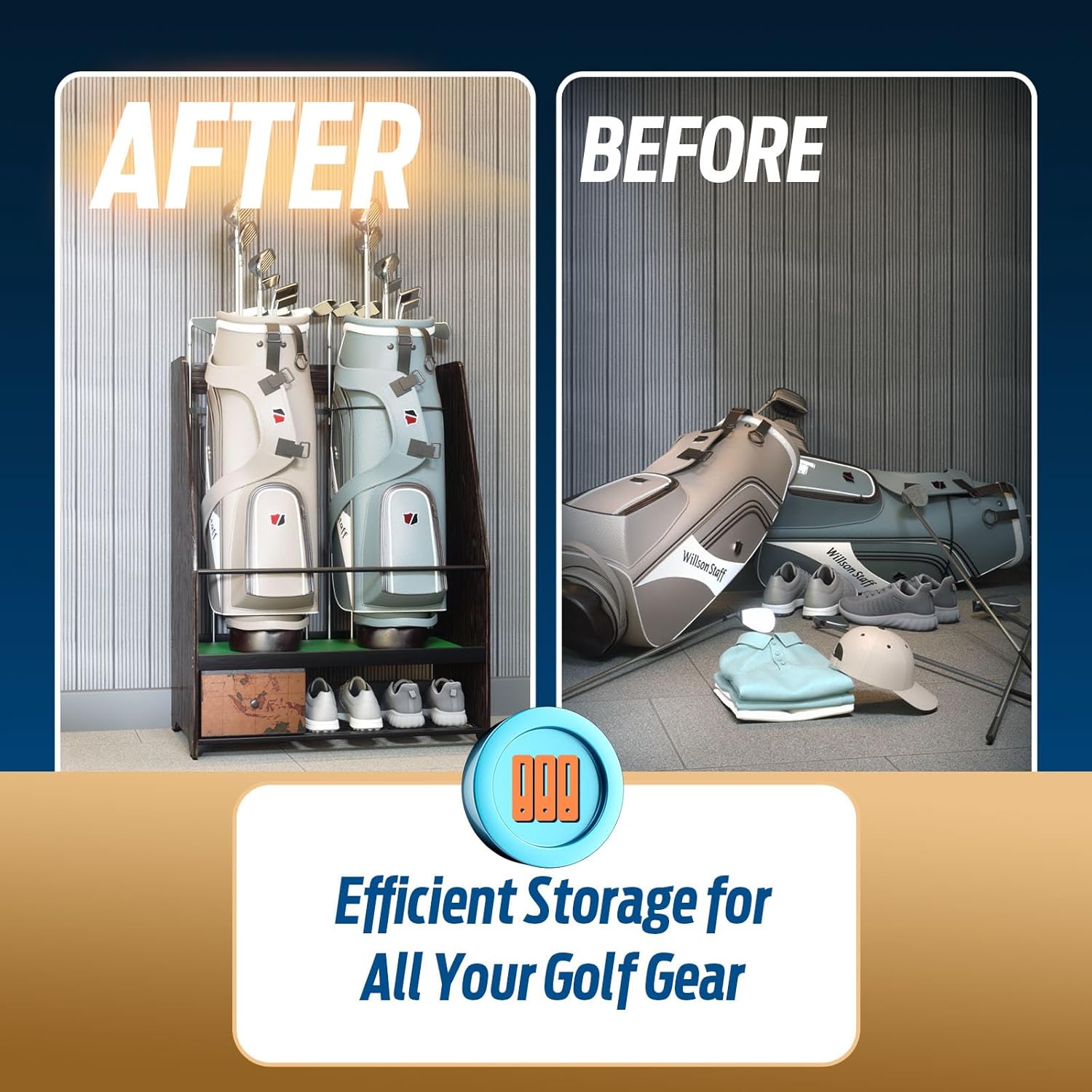 - High Storage Capacity: The Ponsonbay golf bag storage rack holds 2 golf bags, 11 clubs, 2 pairs of shoes, and other golf essentials, keeping all your gear in one organized place