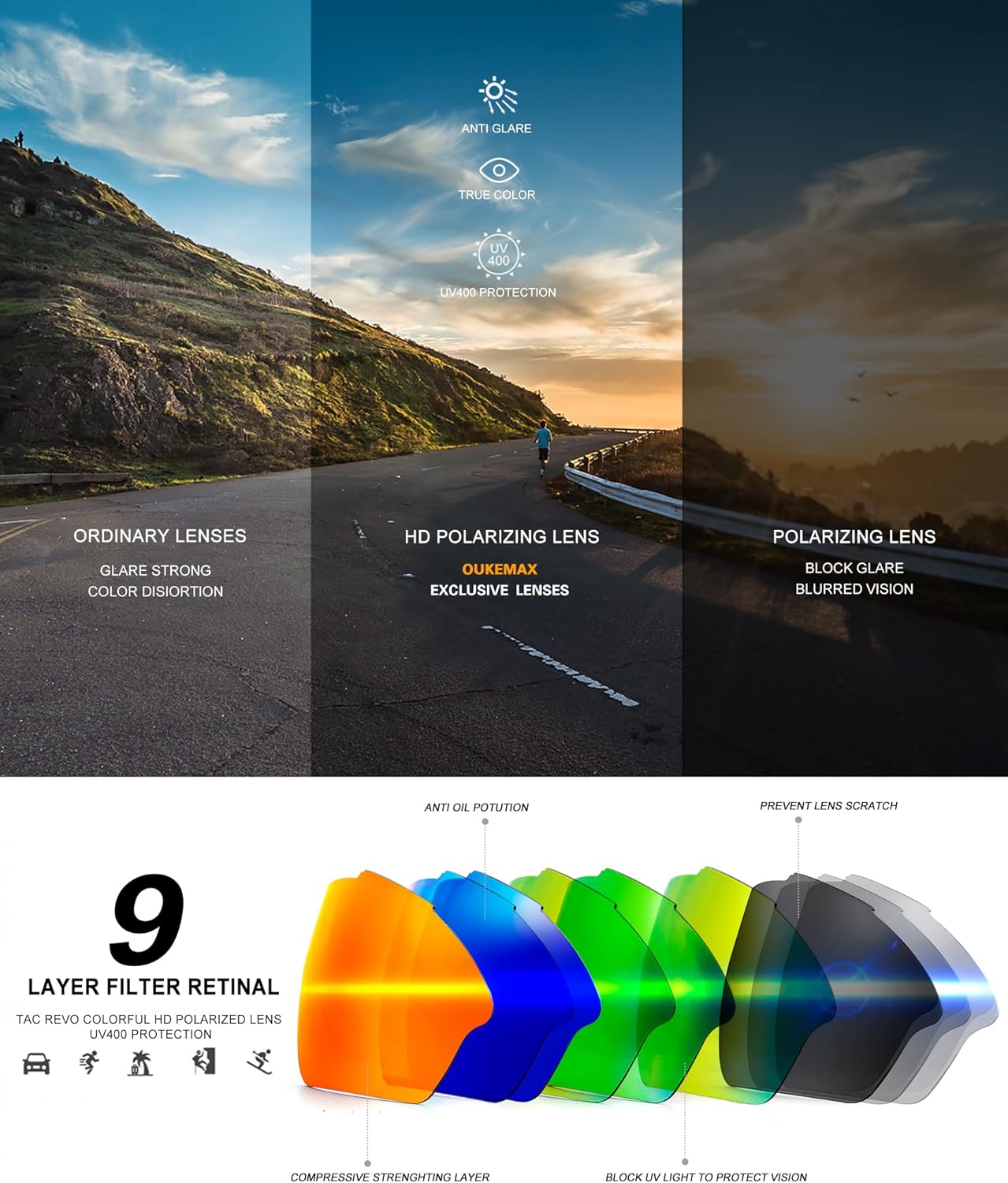 • Sport Sunglasses Men: Designed to meet the needs of outdoor enthusiasts, the OUKEMAX polarized sunglasses men offer superior clarity, protection and comfort. Sports sunglasses are perfect for running, cycling, fishing or any outdoor activity where you may encounter glare problems.