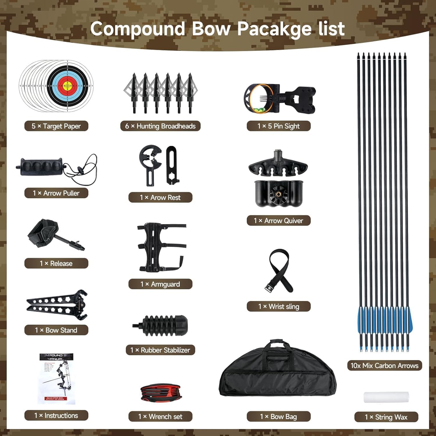 - Packing List: 1 x Compound Bow; 1 x 5 Pins Sight; 10 x Mixed Carbon Arrow; 6 x Hunting Arrowhead; 1x Bow Release; 1 x Bow bag; 1 x Arrow Rest; 1 x Arrow Quiver; 1 x Arrow Puller; 1 x String wax; 1 x Bow Stand; 1 x Armguard; 1 x Wristband; 1 x D-Loop; 1 x Peep Sight; 1 x Wrench Set; 1 x Instruction; 5 x 60cm target paper; 1 x Rubber Stabilizer.