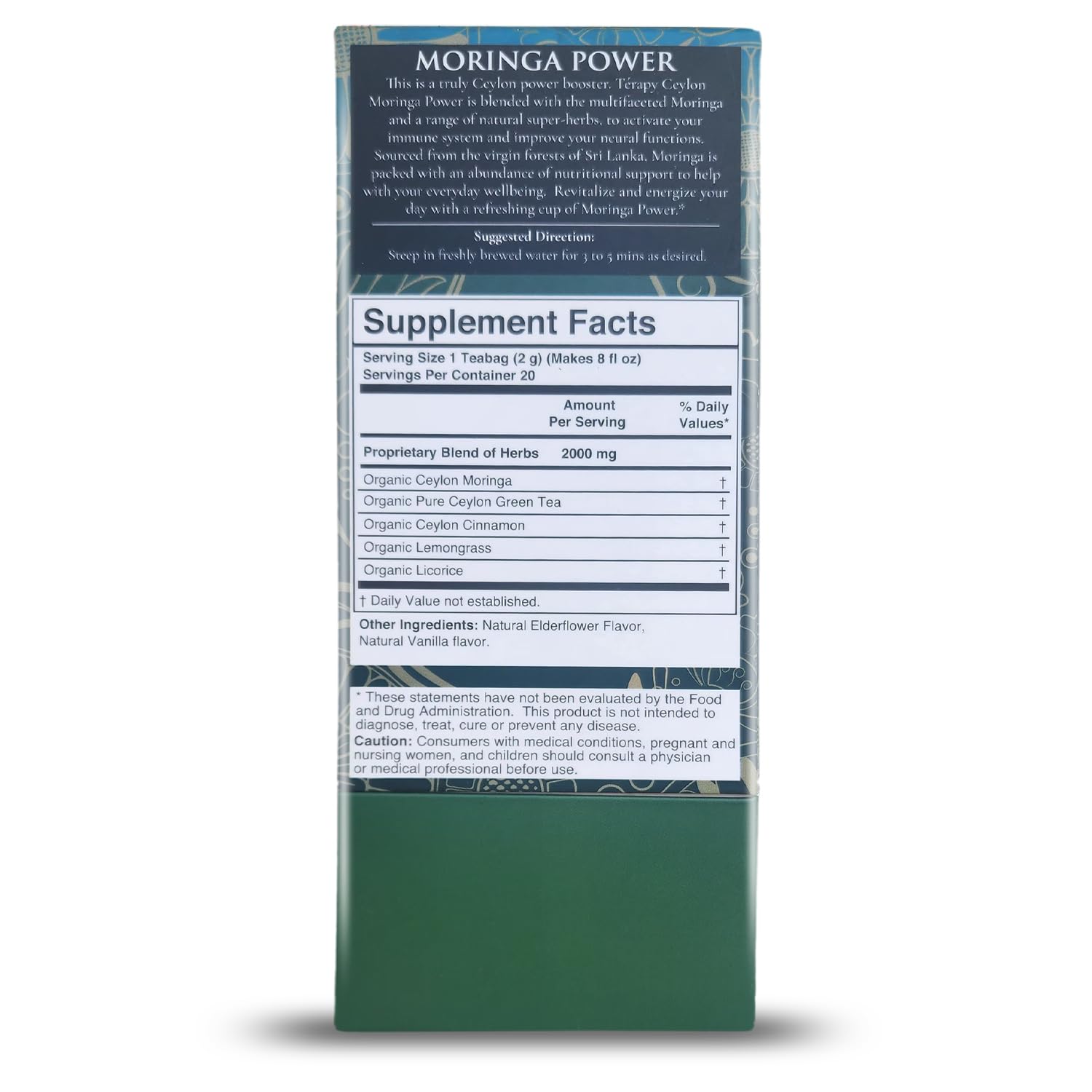 - ๐๐๐% ๐๐จ๐ซ๐ข๐ง๐ ๐ ๐๐๐ ๐๐ซ๐ ๐๐ง๐ข๐ - USDA Organic certified TERAPY AYURVEDIC organic Moringa Tea bags by Tรฉrapy Ceylon exclusively contains premium organic ingredients cultivated on our own estates to craft a healthy and flavorful brew. Our 20 individually wrapped moringa organic tea bag ensuring the highest quality standards.