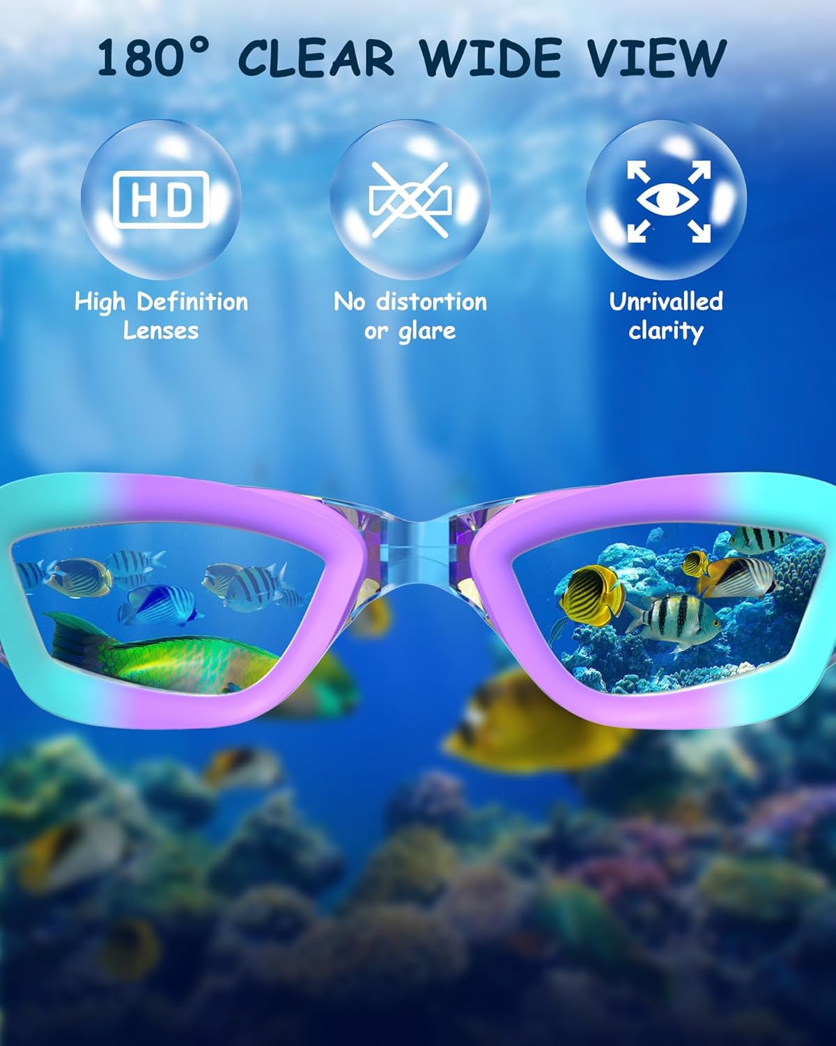 - UPGRADED ANTI-FOG AND UV PROTECTION - Goggles for swimming with kids swim cap is upgraded with more advanced lenses and coatings, 35% more anti-fog and UV protection than traditional lenses, allowing children and teens to clearly see the underwater environment, effectively protecting children's delicate eyes from pool water and strong sunlight, ensuring vision is not blurred or distorted while swimming, protecting children's safety.