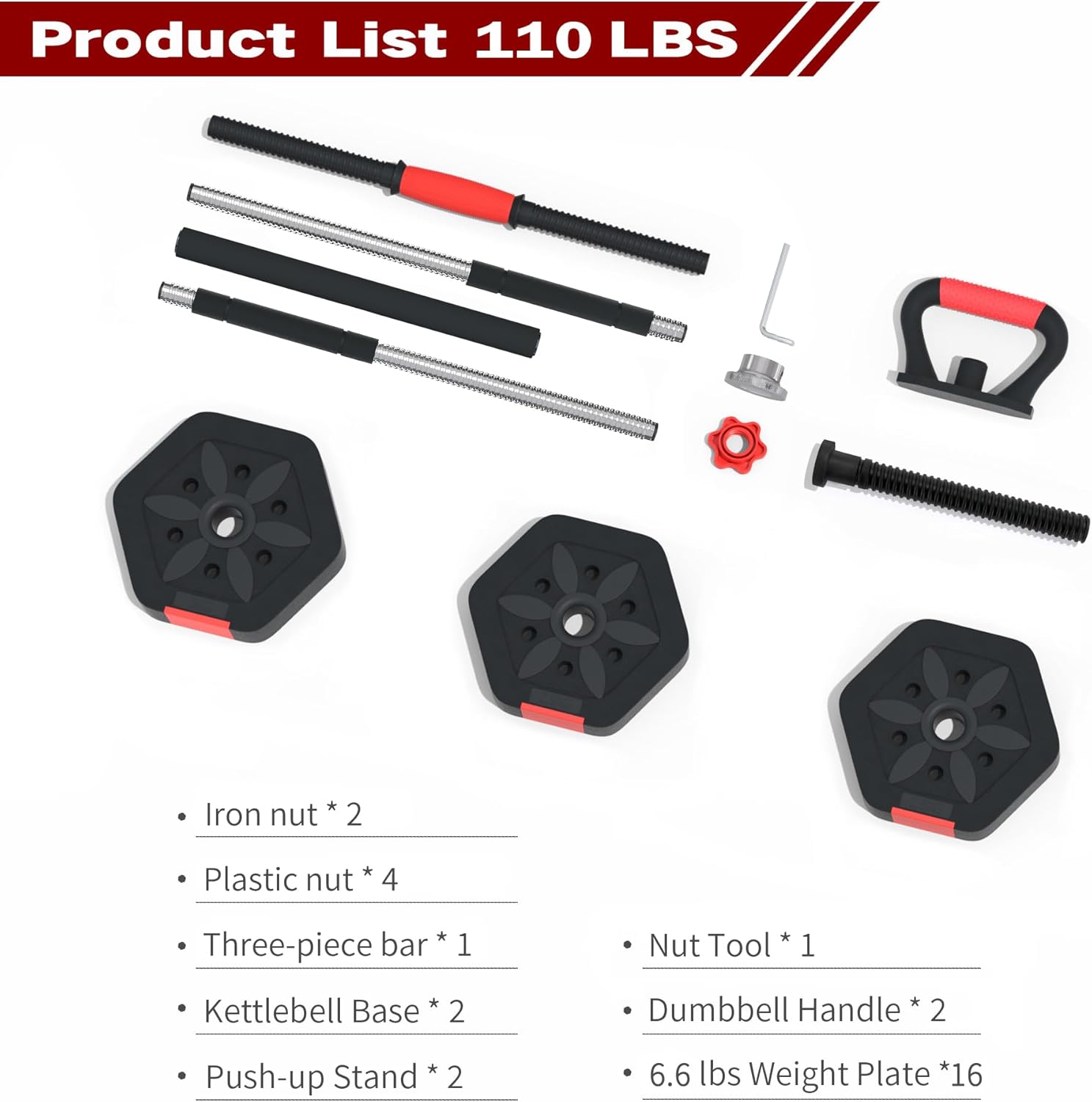 - Adjustable Weight Range - The Vivitory dumbbell set provides a versatile weight range of up to 110 pounds, catering to both beginners and experts. Transform it effortlessly from a dumbbell to a barbell for a variety of workouts, all with high-quality components including connecting rod, handles, screw nuts, and weight plates