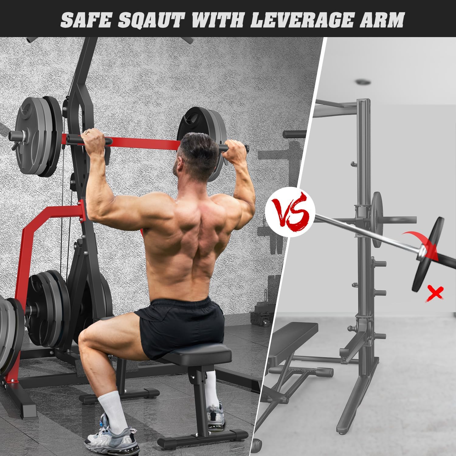 - INDEPENDENT LEVERAGE ARMS: We designed a connecting bar(weight 4.5lbs) for two lever arms(weight 9lbs for each arm). With bar connected, which locks two lever arms together for squats, deadlifts, shrugs, calf raises and so on. Two lever arms can also be used independently for bench press, bicep curls, arm rowing, dip stand.,etc.