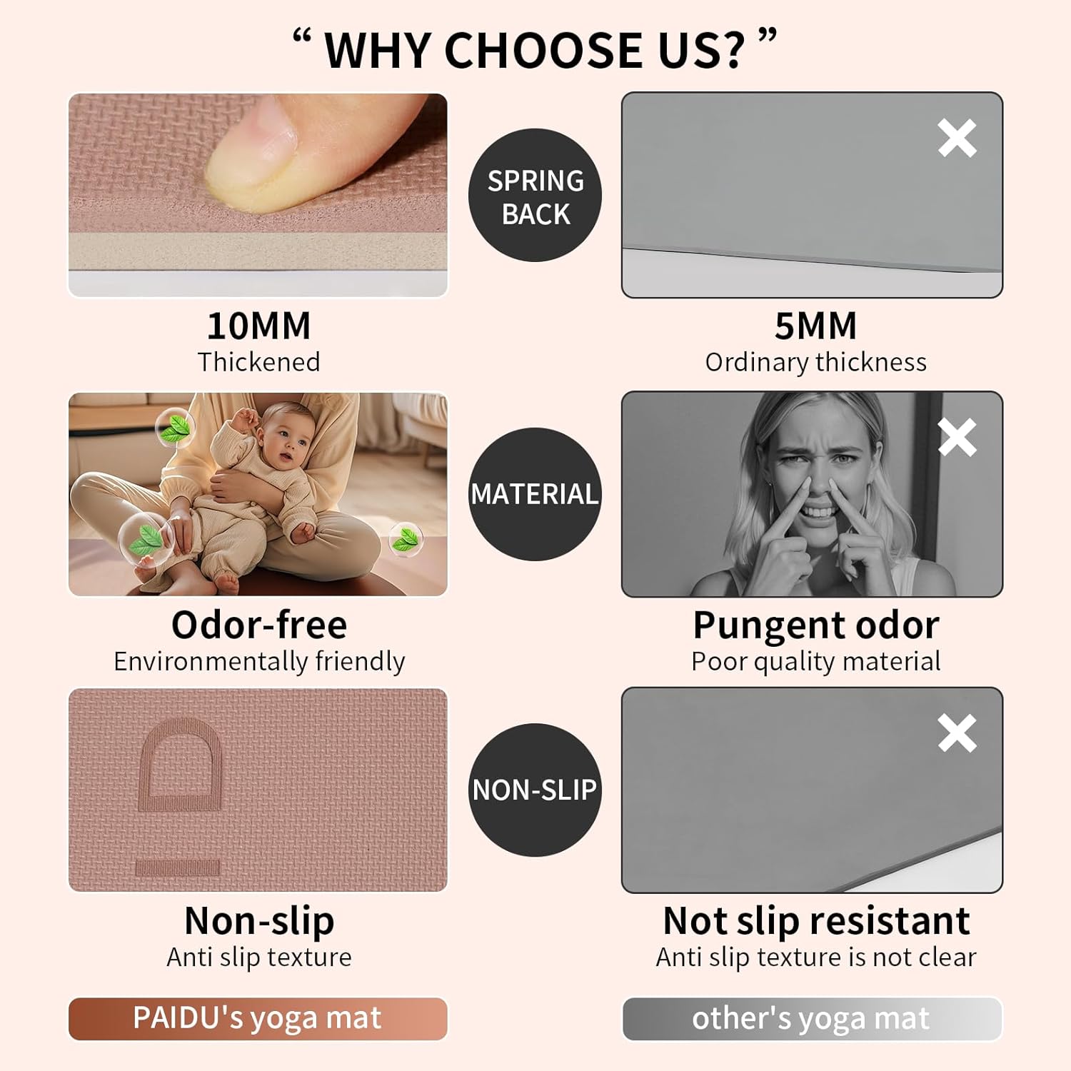 - HIGH QUALITY MATERIALS:Paidu yoga mat made from premium quality POE material, this material is the latest technological improvement to the traditional yoga mats. No latex, no PVC, or any heavy metal.This exercise mat for home workout is flexible, tear-resistant,and designed for long-lasting.durability.