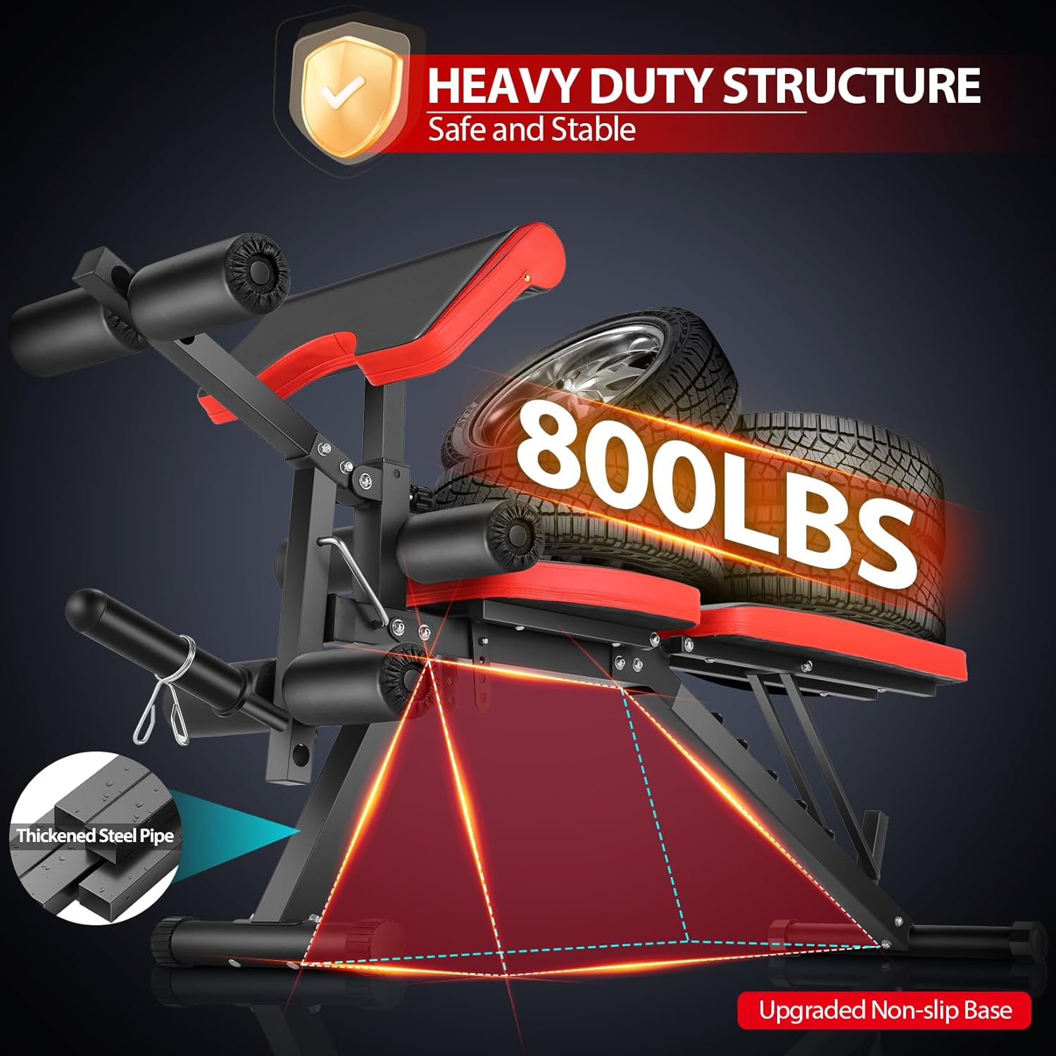 - 【Sturdy and Stable】This weight bench constructed with a sturdy metal frame and a stable triangular structure, the upgraded base adapts to uneven floors. The workout bench supports a maximum weight of up to 800 lbs, ensuring safety and stability.