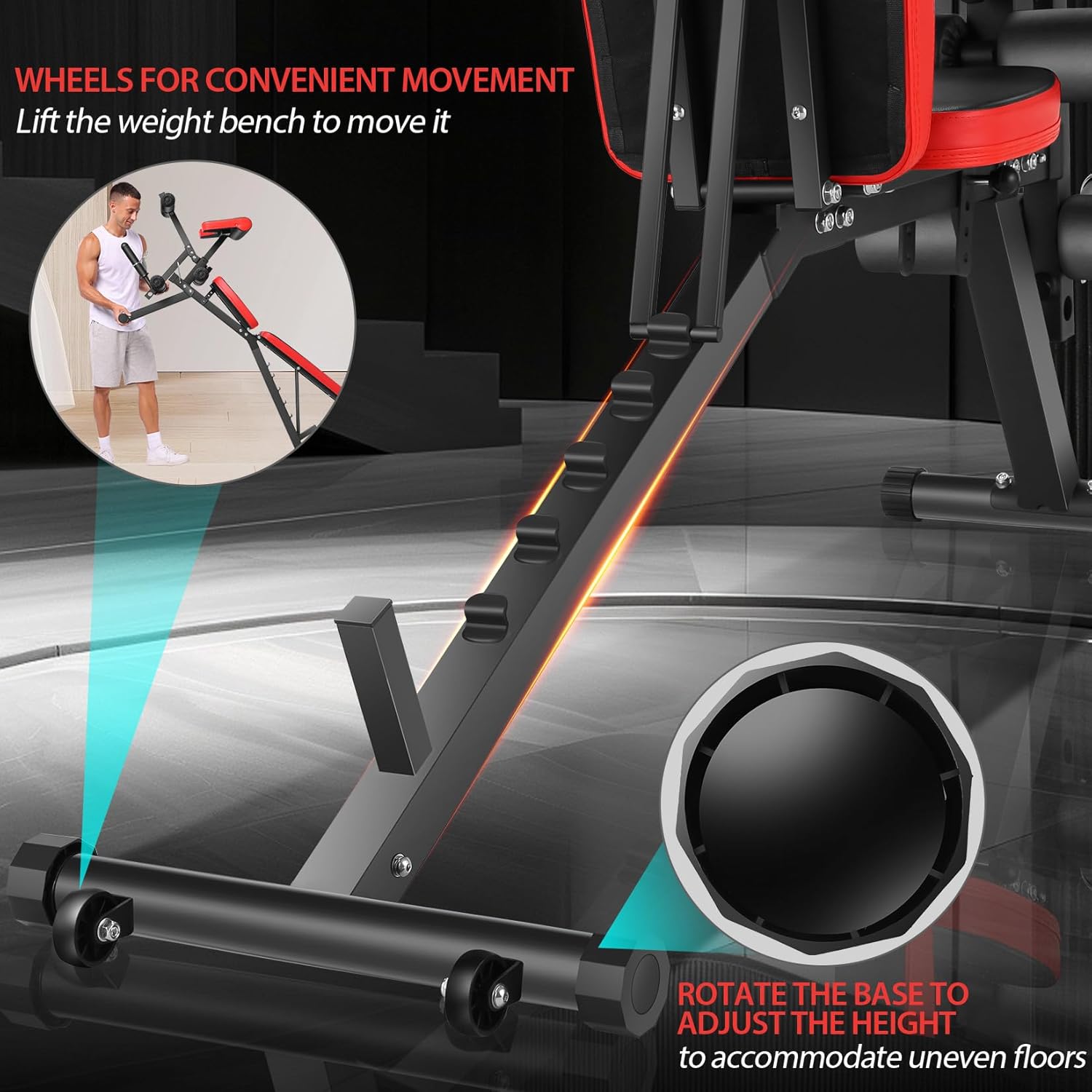 - 【Easy Mobility】Equipped with wheels at the base, the weight bench can be easily moved, making it convenient to adjust its position at home.