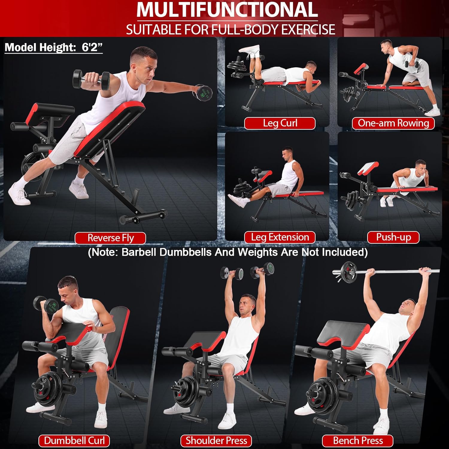 - 【Multi-Functional Training】This weight bench is suitable for exercises such as preacher curls, single-arm rows, dumbbell bench presses, leg extensions, and leg curls, helping you achieve comprehensive fitness results.